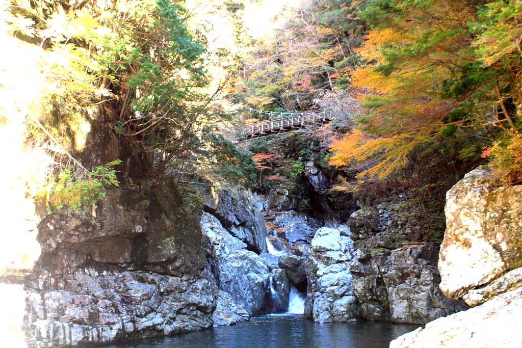| みたらい渓谷は山上川の渓流沿いの整備された遊歩道で、この付近の滝とコバルトブルーの水を見ながら素晴らしい渓谷美を見ながら歩けるハイキングコース。特に紅葉時期は混雑するがその景観は絶景。 | ||||||