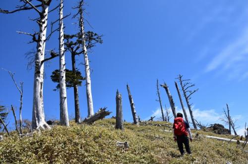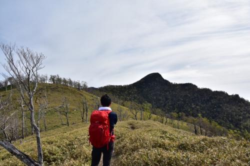 後ろを振り返ると釈迦ヶ岳。これを後で登り返すのかと思うと心やられそう