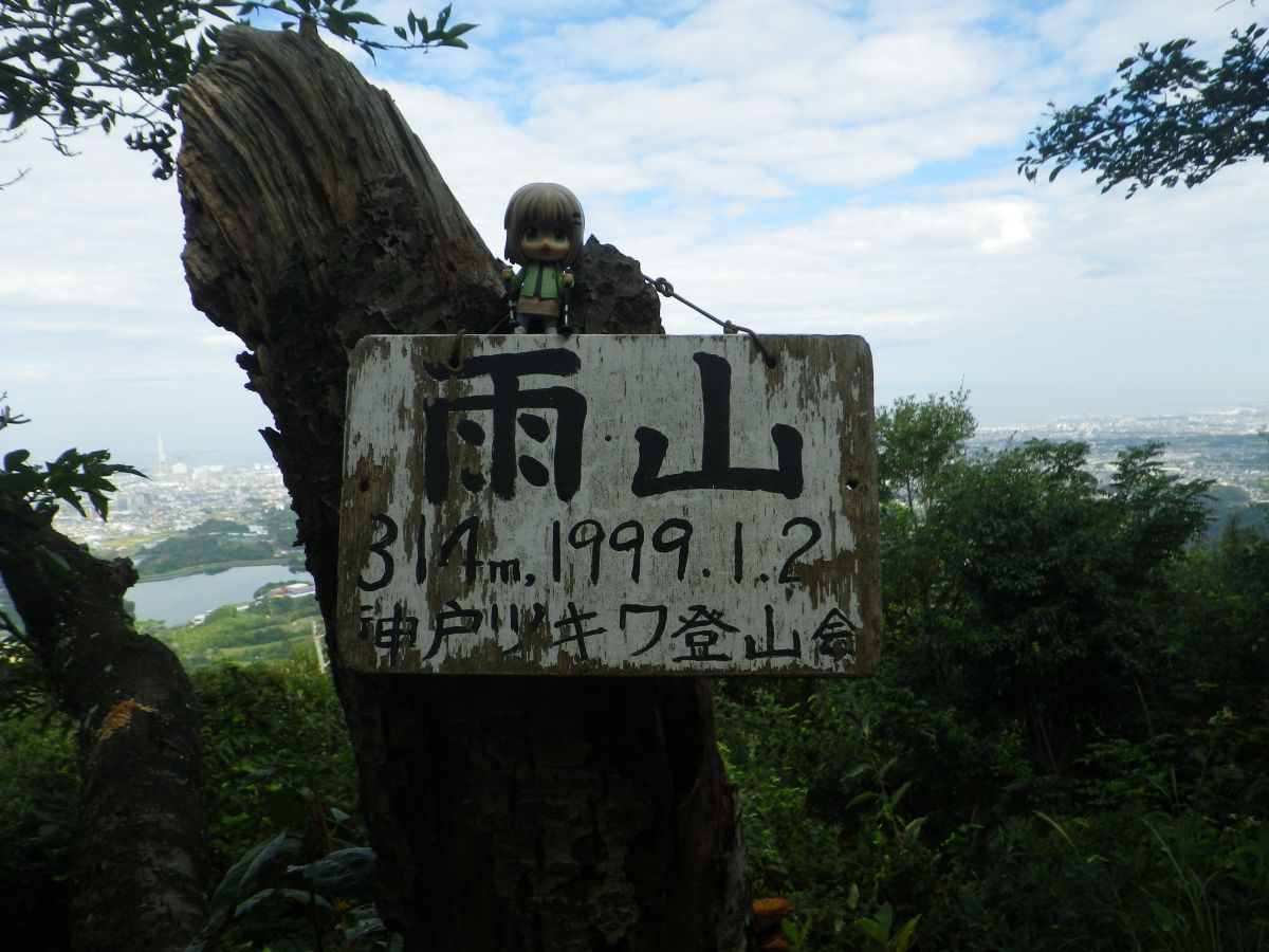 せっかくなので雨山の山頂プレートと雪村あおいちゃんを撮影しておいた。314mになってるけど、他では312mになっていた