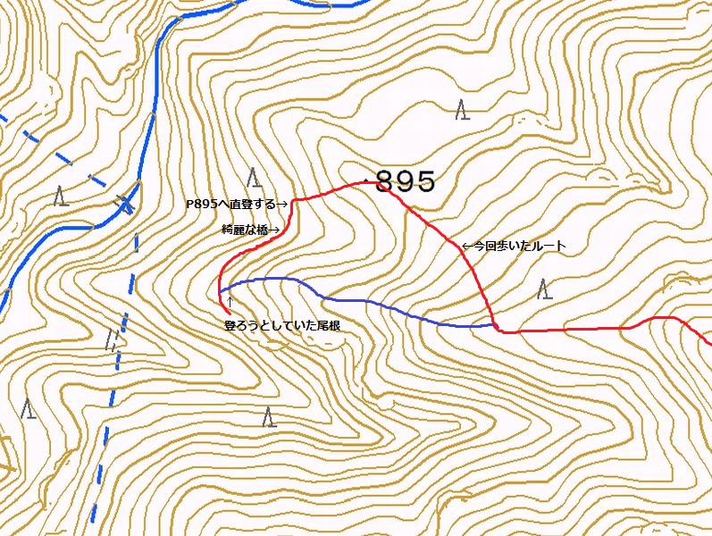 青線が本来登ろうとしていた尾根。行き過ぎちゃったので戻るか考えていたところ、P895に登って尾根に合流できそうだったのでそっちのルートをとることにした