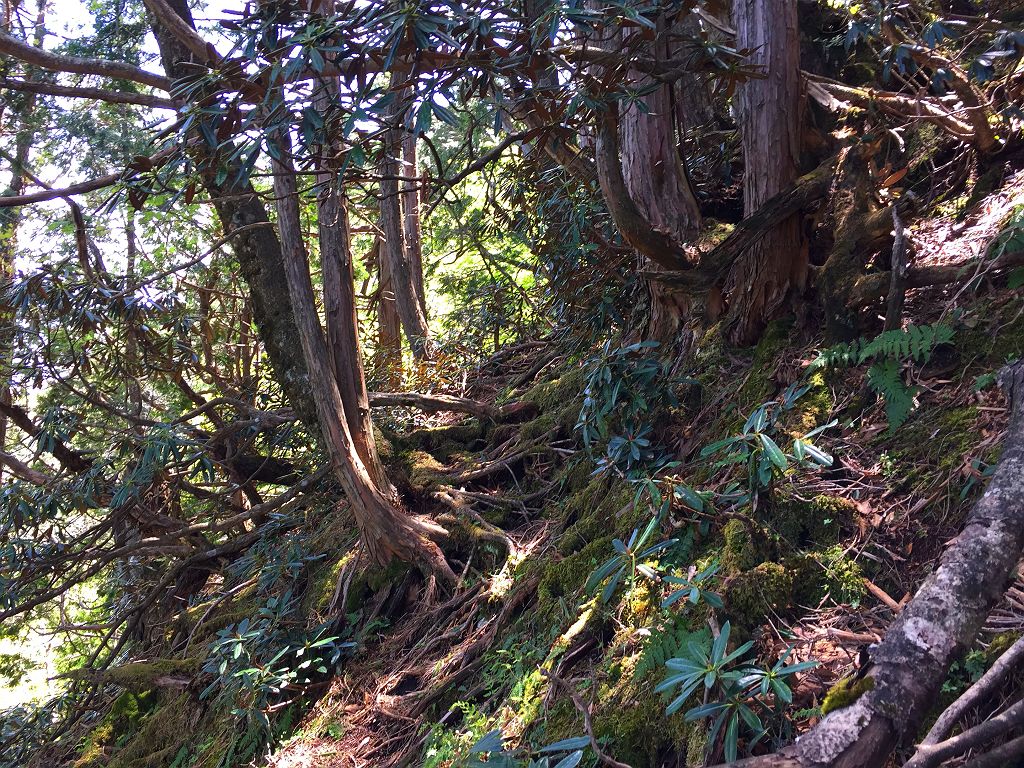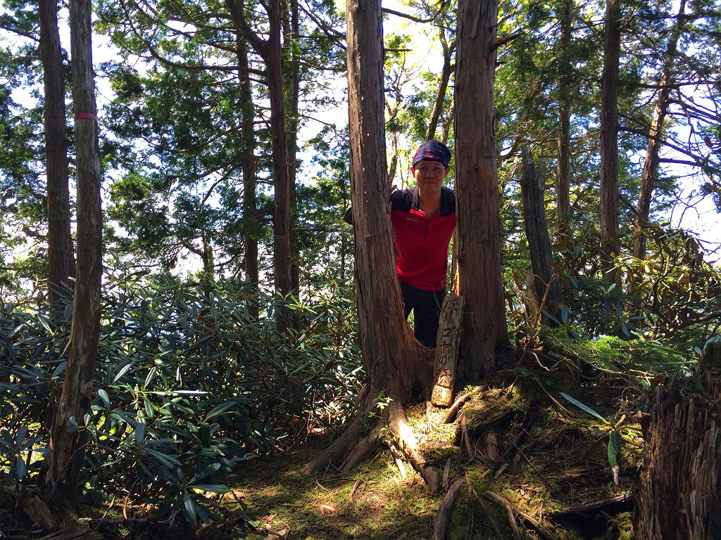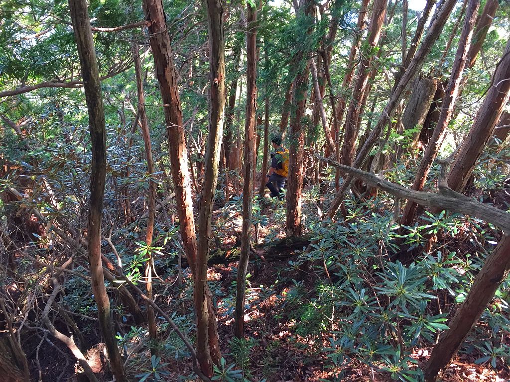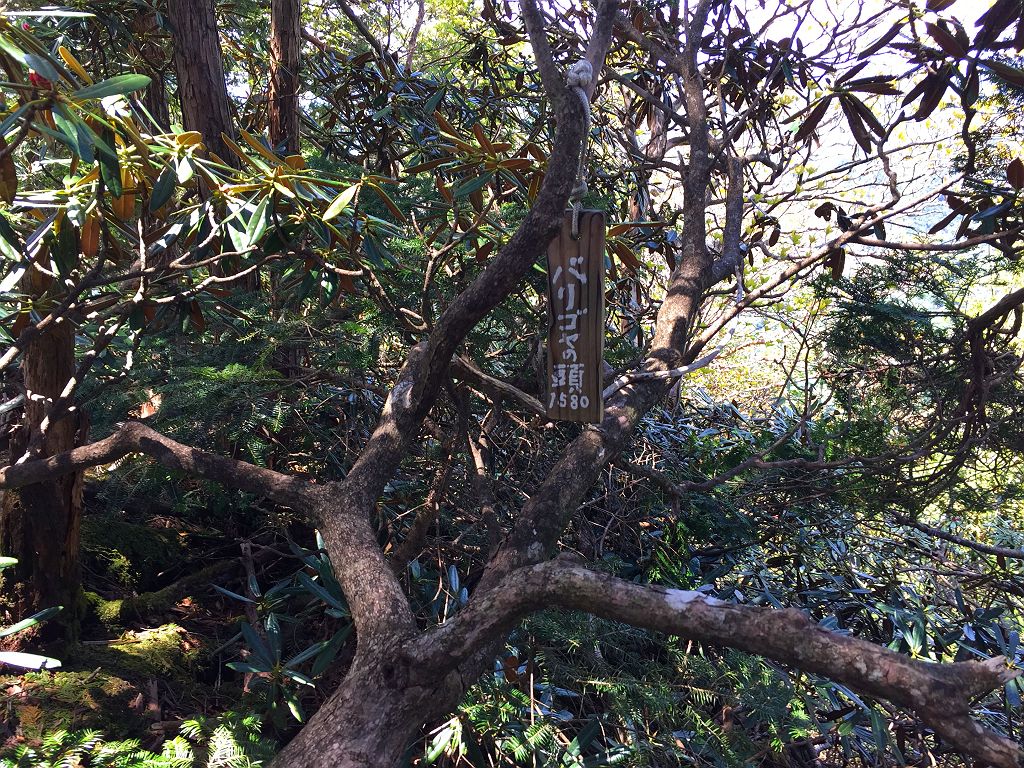 他に登った人の記事やら地図やら見ていましたが、強力の頭までは80%以上が心臓破りの急登で息切れ状態炸裂、景色も樹林帯の中を歩く単調。もはや登山というより、修行といえばいいのでしょう。それにルートなんてあってないようなもので、無理矢理尾根を登ってるといったほうが正しいです。踏み跡もなくズルズル滑るところもあり、浮石も多く何度も落石させてしまい「ラーク!!」となんども叫びました。やっと強力の頭についたときには二人してバテバテでした。そこからバリゴヤの頭まで楽になるかと思いきや、一旦下って直下の登りは偽ピークが二つほどあって、しつこいんです!!しかもそこらじゅうシャクナゲだらけで歩きにくい。やっとこさ念願のバリゴヤノ頭に登頂。