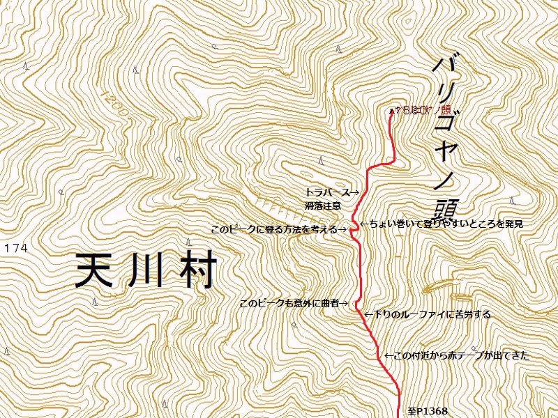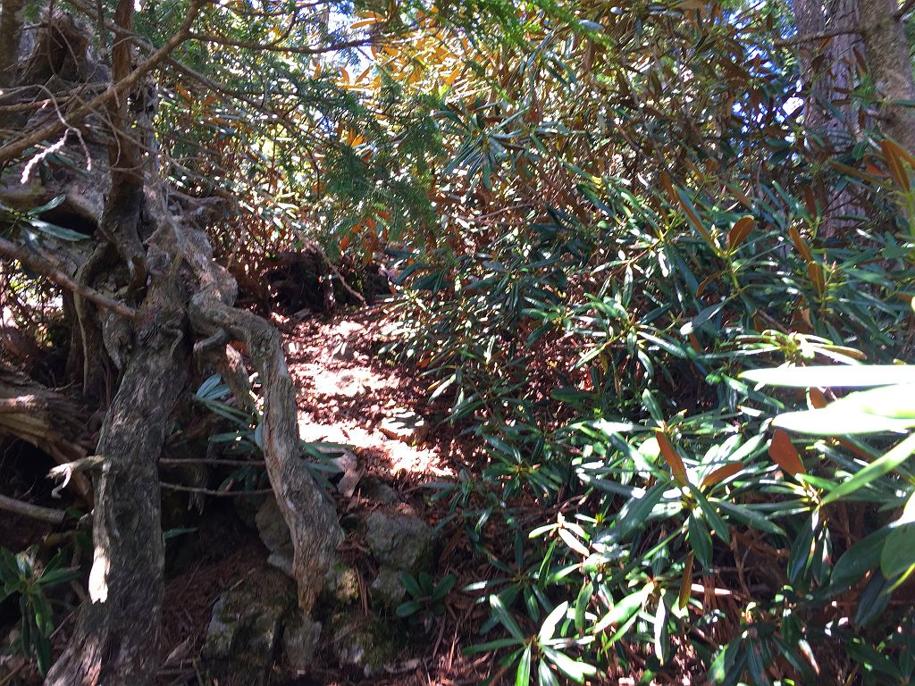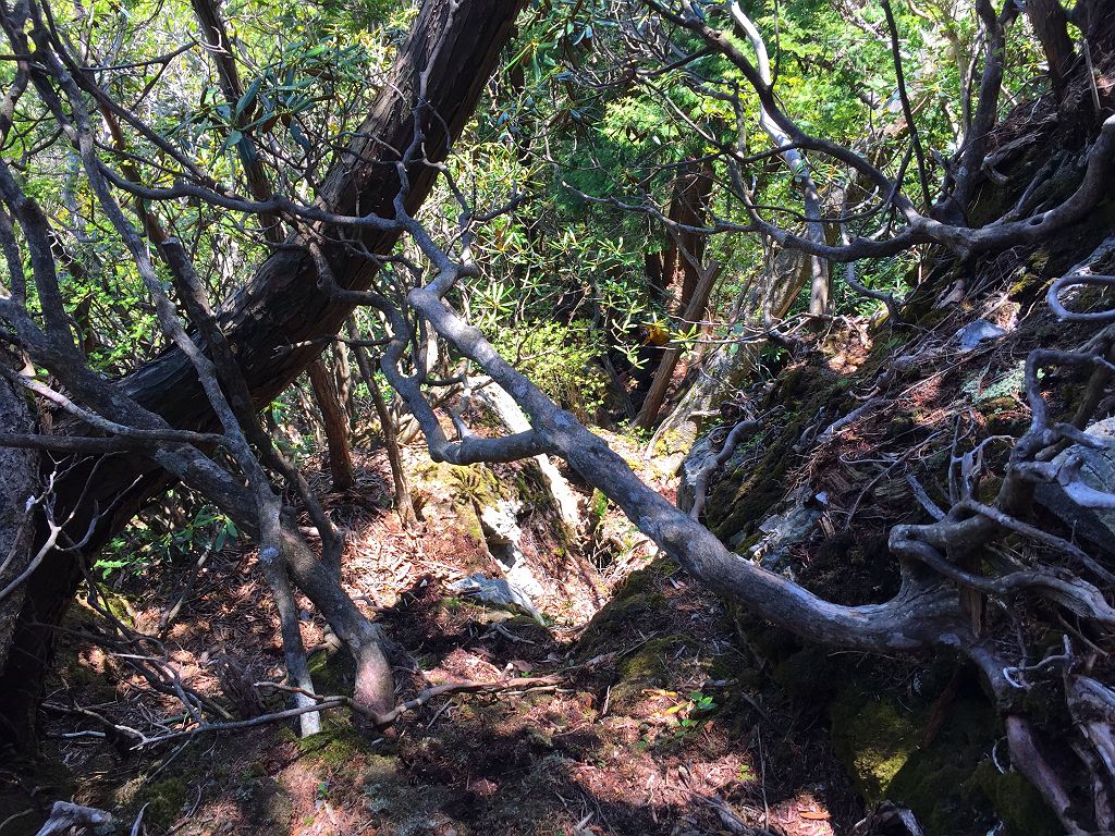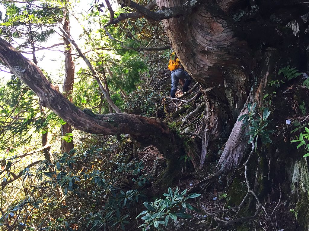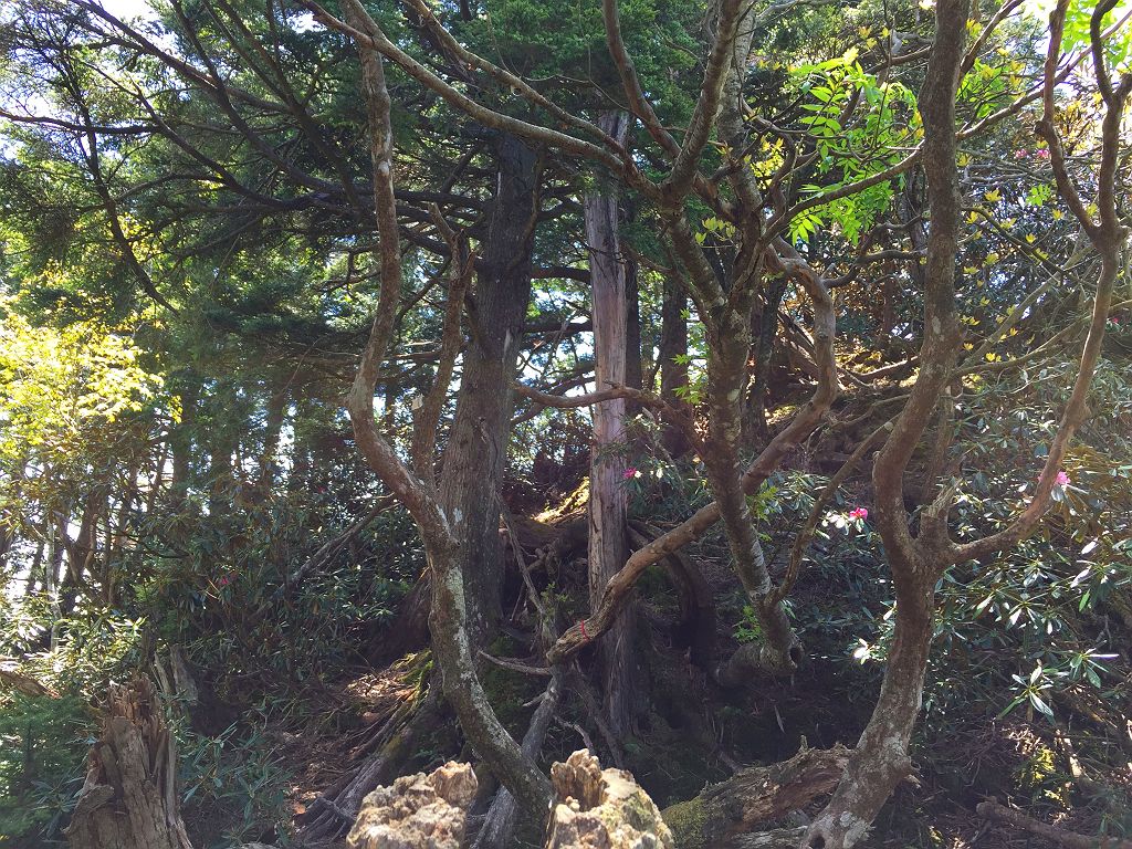 他に登った人の記事やら地図やら見ていましたが、強力の頭までは80%以上が心臓破りの急登で息切れ状態炸裂、景色も樹林帯の中を歩く単調。もはや登山というより、修行といえばいいのでしょう。それにルートなんてあってないようなもので、無理矢理尾根を登ってるといったほうが正しいです。踏み跡もなくズルズル滑るところもあり、浮石も多く何度も落石させてしまい「ラーク!!」となんども叫びました。やっと強力の頭についたときには二人してバテバテでした。そこからバリゴヤの頭まで楽になるかと思いきや、一旦下って直下の登りは偽ピークが二つほどあって、しつこいんです!!しかもそこらじゅうシャクナゲだらけで歩きにくい。やっとこさ念願のバリゴヤノ頭に登頂。
