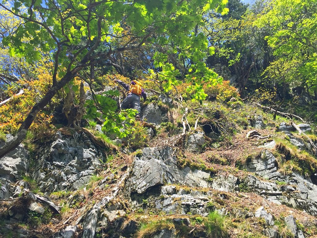 裏側のコルに到着したが、次のピークは岩場になっていたので登るの付加。をどう登ればよいのか考える