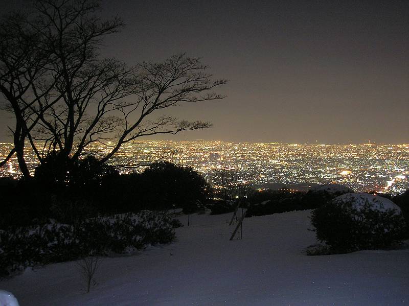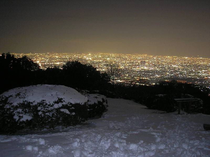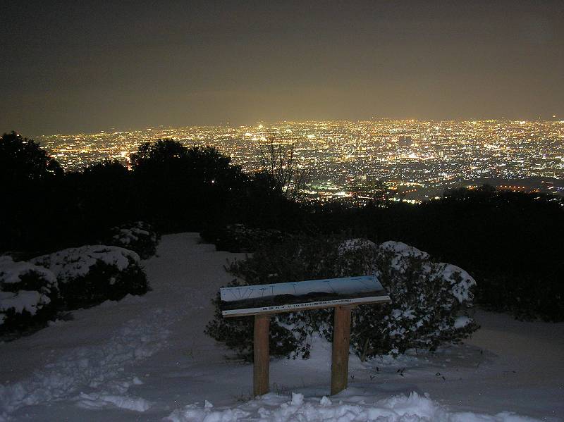 国道308号線が通行止めのため、枚岡公園より登りました。 枚岡山展望台より上は雪道が凍っているためアイゼンを装着。 これは実際に行って見ないとわかりませんが、 雪と夜景のコラボがこれほど完璧な景色を私は知りませんでした。正直、見た瞬間に言葉失いました。 今まで見てきたここの夜景は何だったのかと思わされるくらいでした。しかも、通行止めになっているため、暗峠から登るのは無理でしたし、生駒スカイラインもチェーン規制であるせいか、雪道であることも含めて人がいませんでした。広場だけ少しだけ寒さを感じましたが、他はそこまで寒くなかったです。