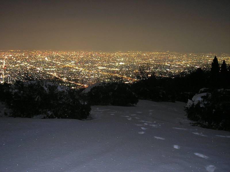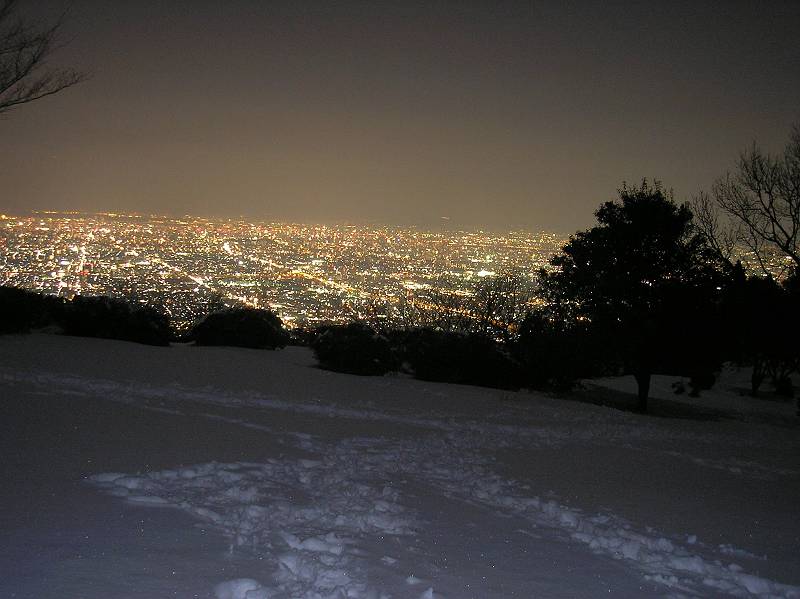 シルエットとなる木と積雪とバックの夜景。この木が樹氷だったらさらに最高だったかも