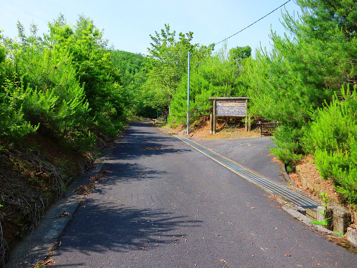 ここがおそらく管理道の舗装道終点地点だと思われる。真ん中の道を登っていったピークが山頂となる