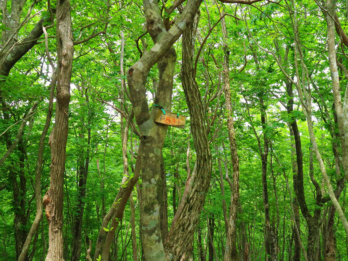 831ピークに到着。地図を確認すると地蔵杉まではまだまだ距離があるし、もう尾根に踏み跡はないバリルートになる。熊の出没情報も含めて単独で無理をするのは辞めようと決意した