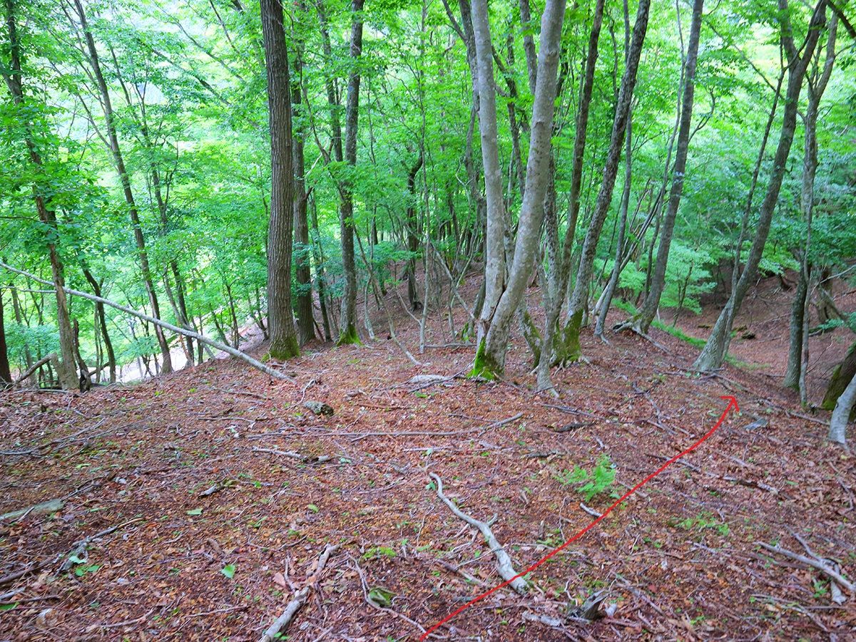 831ピークを少し下ったところで管理道が見える。尾根から右へ右へ下って行けば管理道に出ることができそうだったので無理矢理下った