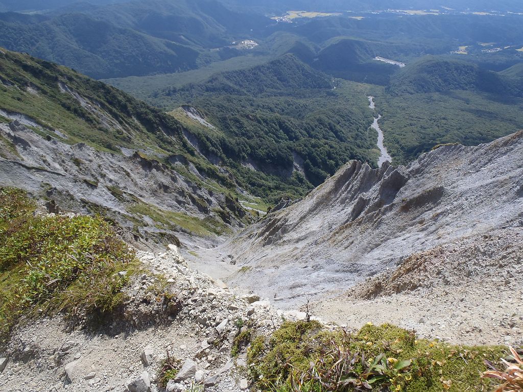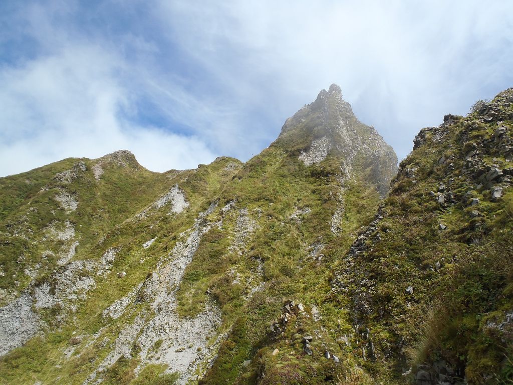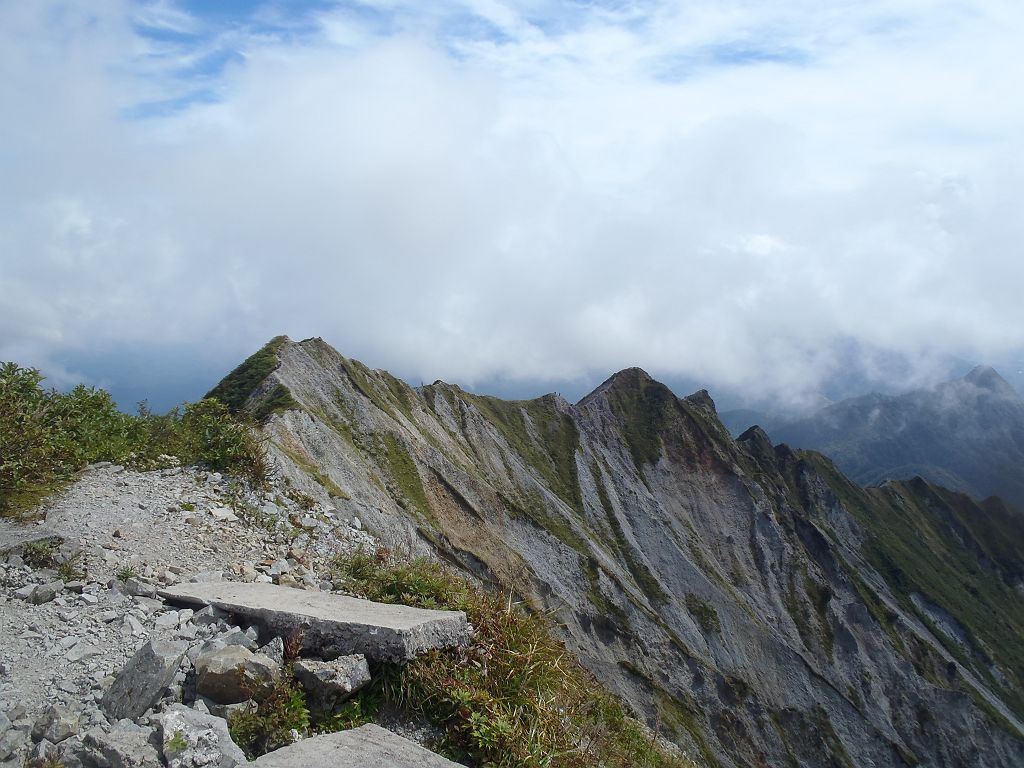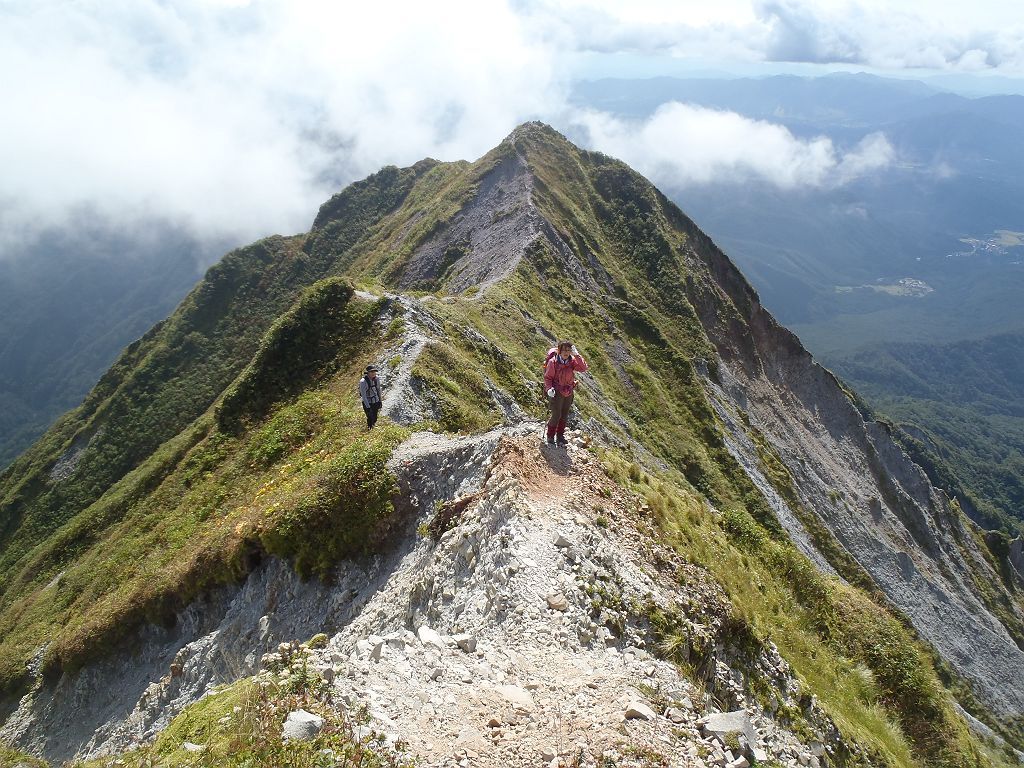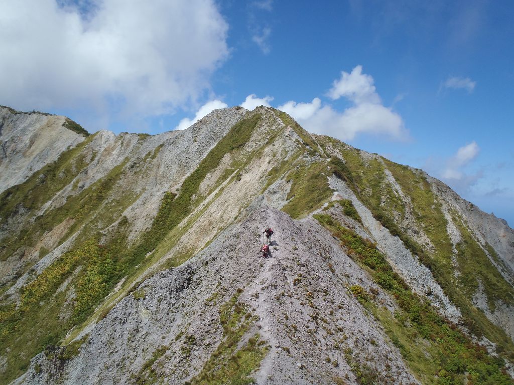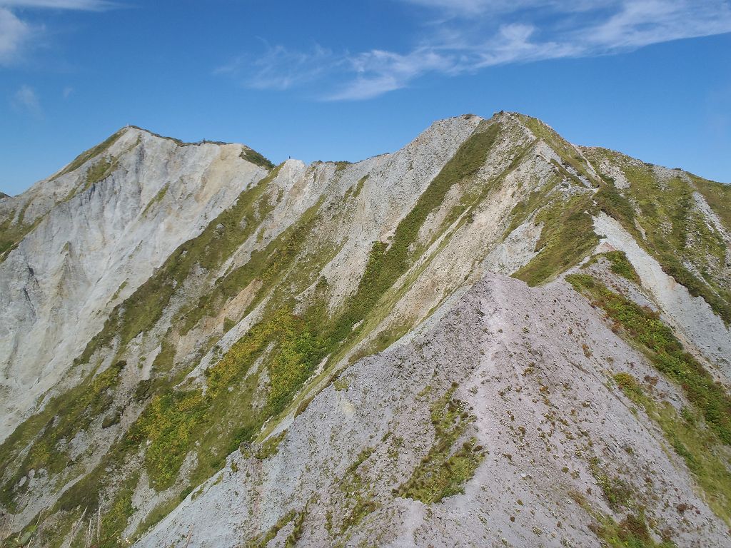 下山時剣ヶ峰と稜線を振り返る。細尾根の下りは滑りそうで怖いがこれもストックあるとかなり安定した