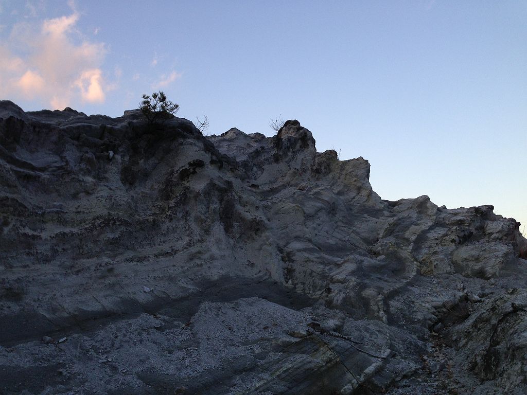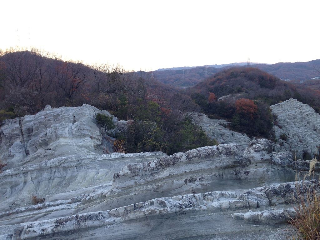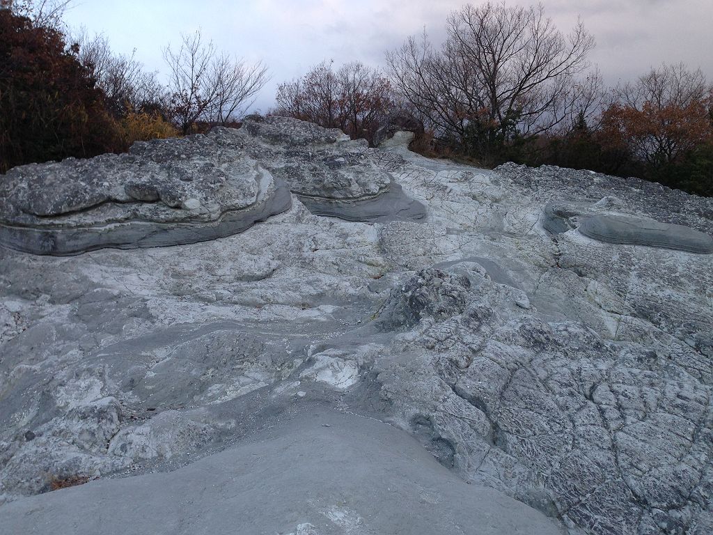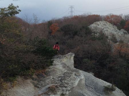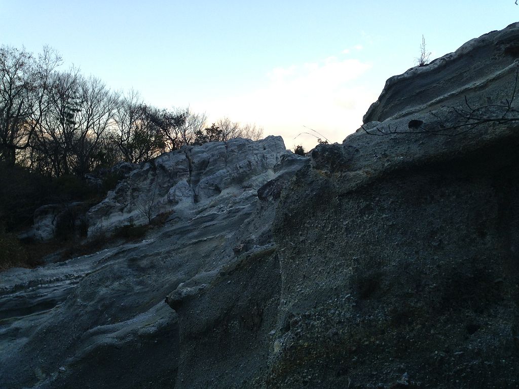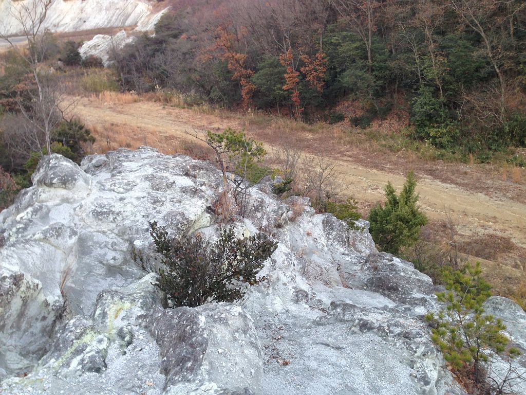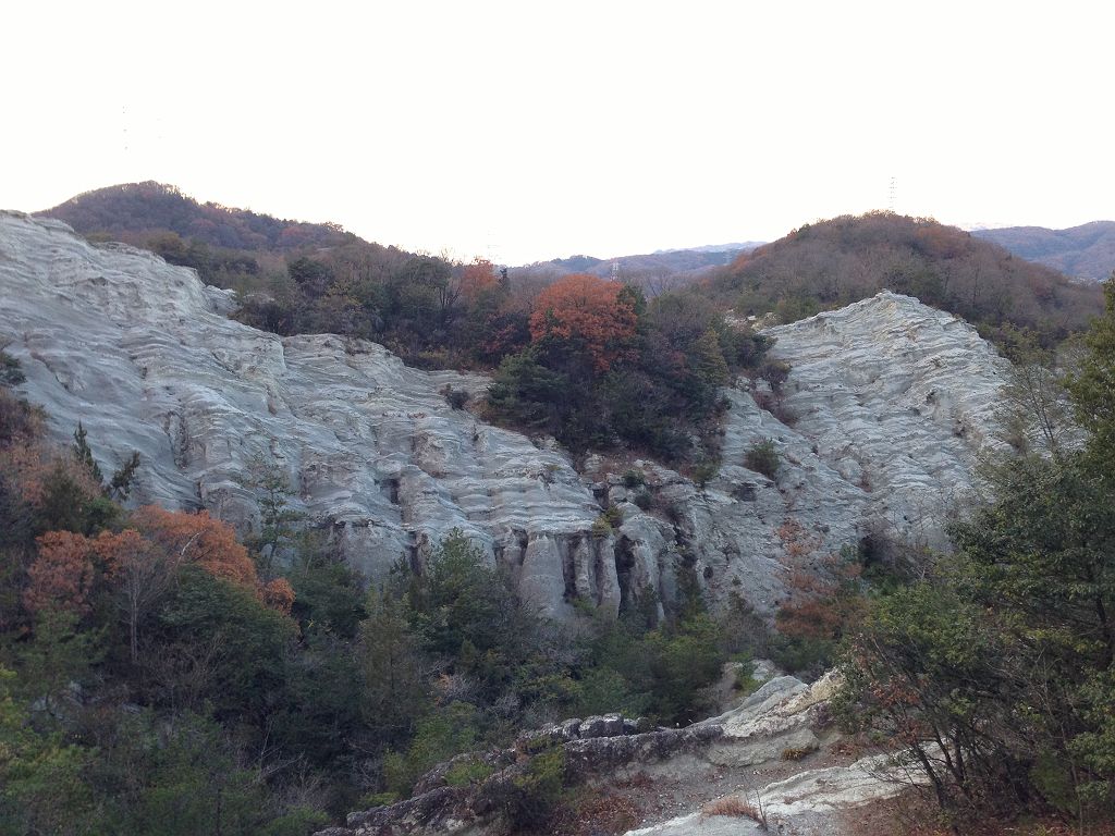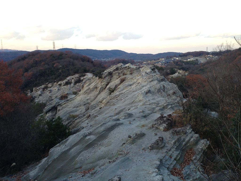 いつか行こうとしていた屯鶴峯。なかなか機会がなかったのですが、足を痛めたのはしかり運動不足にならないようにいってきました。屯鶴峯は二上山の火山活動により凝灰岩が露出して奇岩群となった岩山。ルートはテープ頼りで進むのがいいですが、おもしろくないので山頂までできるかぎり岩場を歩きました。ここの見所は迫力ある岩場もしかり、灰白色の断崖、地層や岩の形も珍しい感じです。ここだけまるで別世界にきた感じがしました。ルートは山頂までいった後、少し戻ったところにピンクのテープがあり、そこの岩場の尾根伝いに砕石場の作業車道?のようなところまで岩を下って右へ。軽いなだらかな斜面を登ると池がみえて道路に出れます。