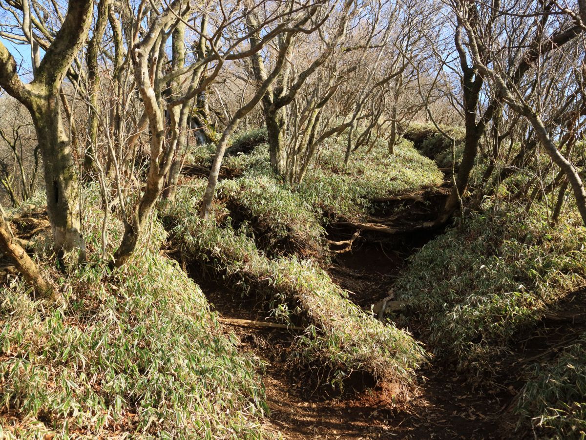 笹地帯になって、この付近は泥で滑りやすく登りにくい。あちこちに踏み跡があって登りやすいところを選んで登る