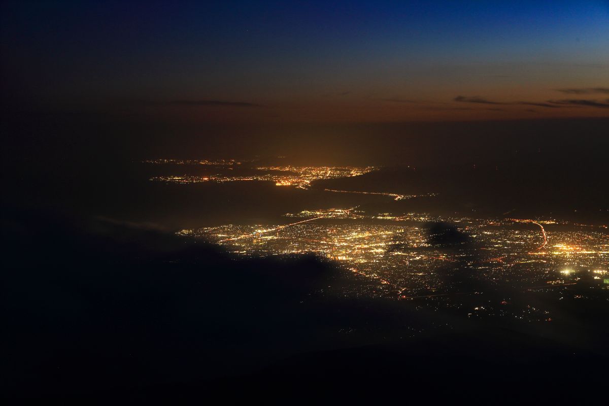 越前岳からの西側のトワイライト夜景。海岸線が特徴的で美しい