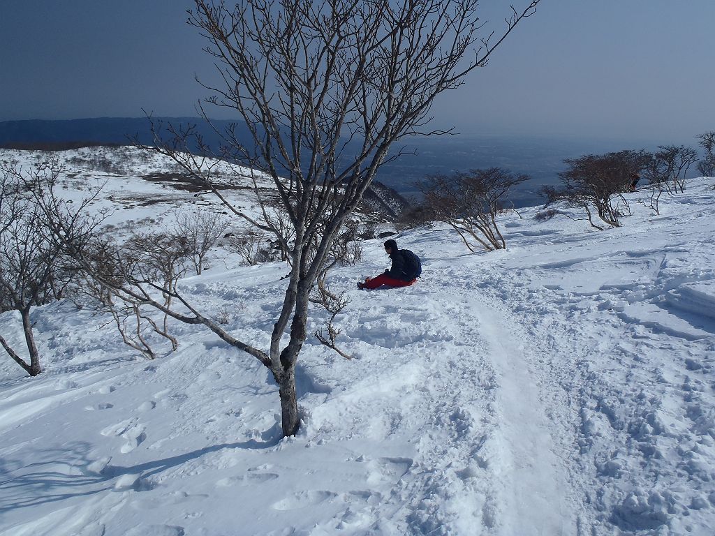 前から冬季に登りたかった鈴鹿山脈の藤原岳。前回は体調不良でいけず、その前は雪が多すぎていけず、今回は三度目の正直でした。朝、ちょい体調不良でまた無理なので竜ヶ岳に変更か!?と思いきや頭痛薬でなんとか治りました。今回はあの藤原の斜面をスキーで滑ってやろうとと思いましたが、思ったより雪が少ないのでヒップに変更。6合目付近から雪景色にかわってきました。八合目まで余裕かましていましたが、そこから直登コースで息切れ。9合目について展望が絶景。田園風景から桑名や名古屋の市街地をはじめ、御嶽山や乗鞍岳、中央アルプスが一望できました。ちょい休んで藤原山荘に登り始めたましたが、さらに直登が続いてバテないようになんとかゆっくり目に登っていきました。山荘について晴天の雪景色はかなりいい感じでした。そして藤原岳のピークをみると遠い感じがしましたが、歩いてみると近かったように思います。山頂は360度のパノラマ絶景で登ってよかったと思う瞬間。登りが続いて暑かったのが一気に寒くなりながらパンを食べて休憩。その後ヒップで滑走して下りましたが、ヒップが思う以上に超スピード。ちょい急斜面だと危なかったです。藤原山荘に戻り、もうどうせなら天狗岩もセットでいくことに決定。天狗岩は距離は少しあったものの、傾斜のアップダウンでなだらかな道を進むのでそこまでしんどくなかったです。風もでてきて寒かったので山荘に戻りコーヒーブレイク。ラストはヒップで滑って7合目あたりまで降りますが、かなり急斜面だと直お尻で滑らないとやばかったです。ただ、ヒップと滑りでかなり時間は短縮できました。ラストもさっさと飛び跳ね小走りで下り1時間程度で登山口に到着しました。藤原岳は思ったとおりの絶景でいい山でした。ヒップで滑ったり、走って下ったり、藤原のかまたり~♪