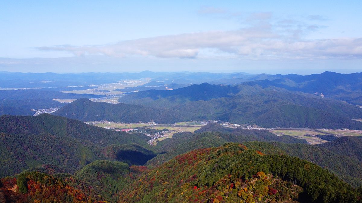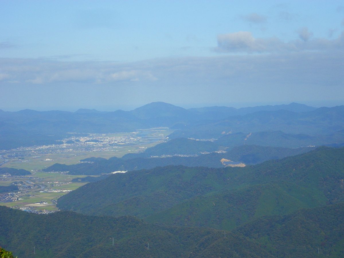 豊岡市や出石町方面の展望。向こう側の山は来日岳だと思われる