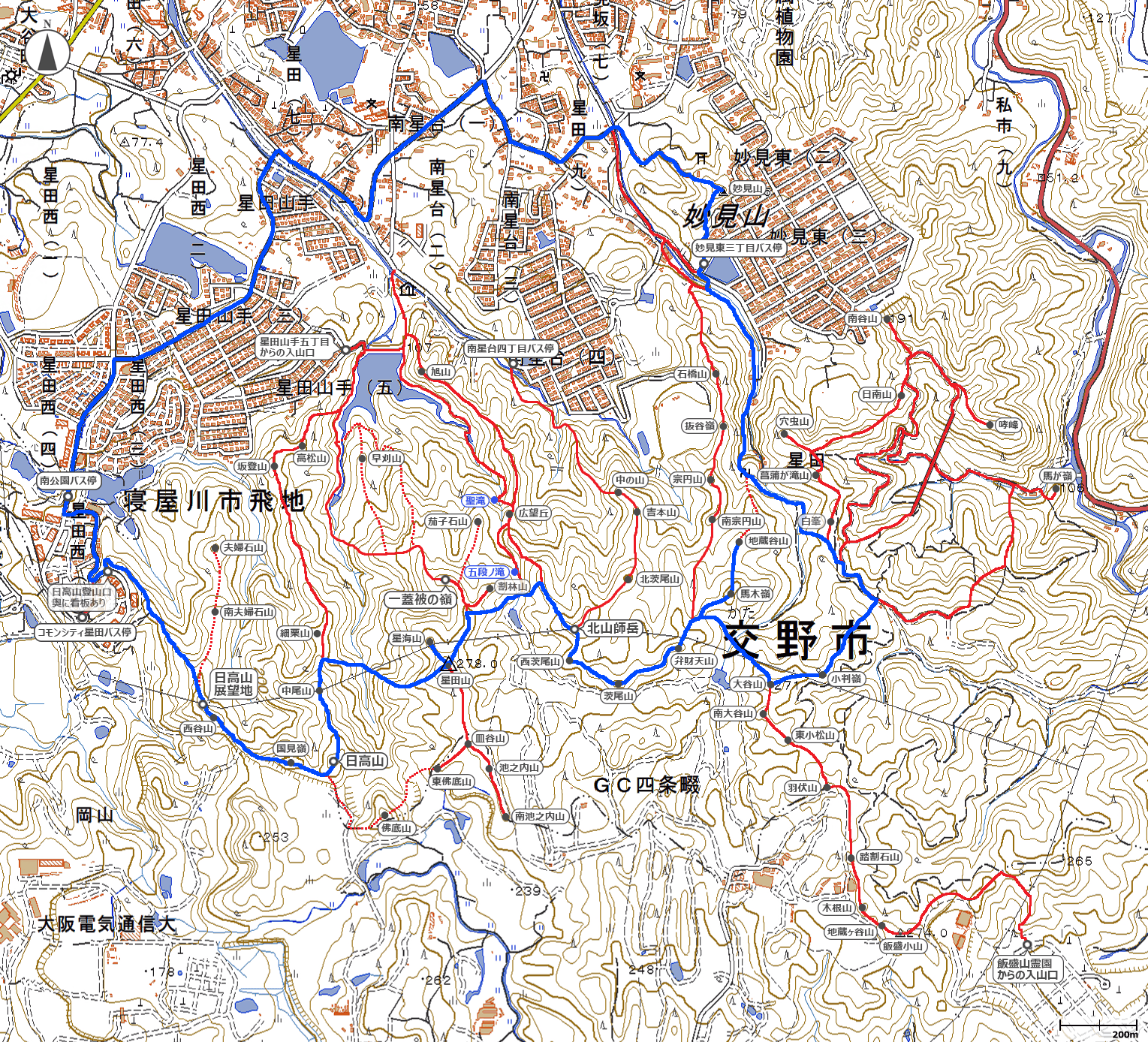 星田連山は多数のピークがあるようです。登山を始めた頃に星田の山を登った記憶がありますが、こういった縦走したことがなかったのでやってみました。地図にないバリルートで道標もなく地図と直感頼りのかなり楽しい山行になりました。とはいえ分岐がたくさんあり地図あってもかなり迷い倒すかもしれませんが、迷ったところでどこか街に出れるのでそこまで心配はいらないとは思います。また、低山といえどかなりのアップダウンの続く稜線ので結構足やられました。本来は夜景を目的としたナイトも含めてという感じだったのですが、日高山の山頂で暗くなりました。日高山の中腹で大阪北部の夜景が一望することができましたが、少しズレて一蓋被の嶺の山頂へ行くことができなかったりしたので再チャレンジします。というか、明日、天気が崩れなかったらいきます!こんな近くに迷路と地図遊びできるような星田連山なので全部登りたいです。