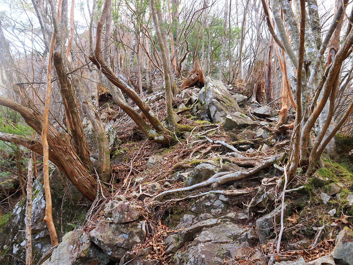 尾根道はとても普通の登山道というより無理矢理に尾根を登ってる感じの道だった。結構急登で息が切れる
