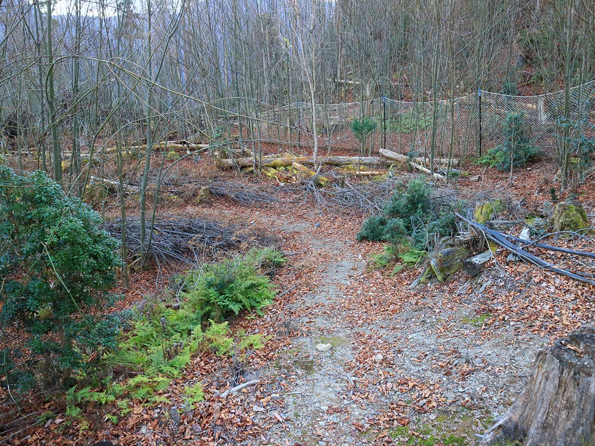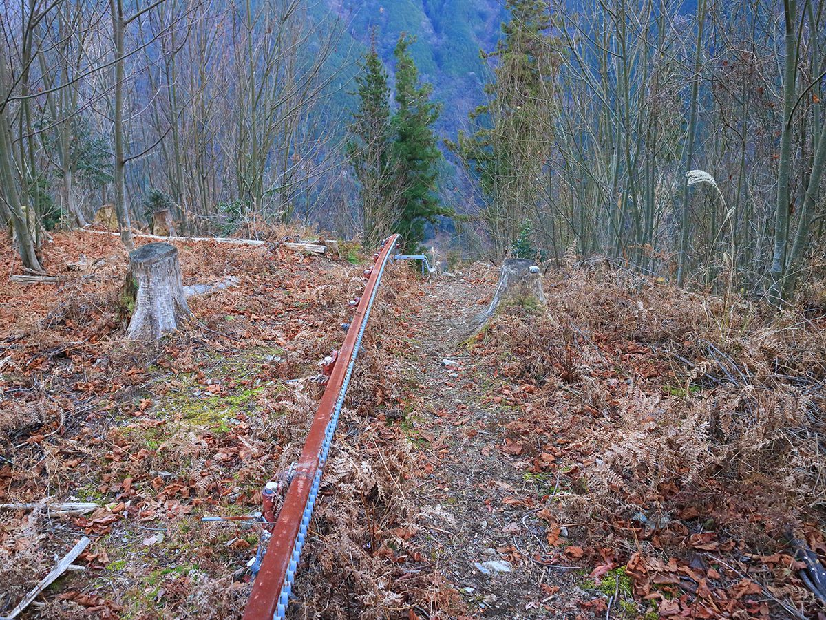 ここで柵を開けずにレールから離れて右へ下りていく。そして再びしばらく下って左の植林帯へ入って行く