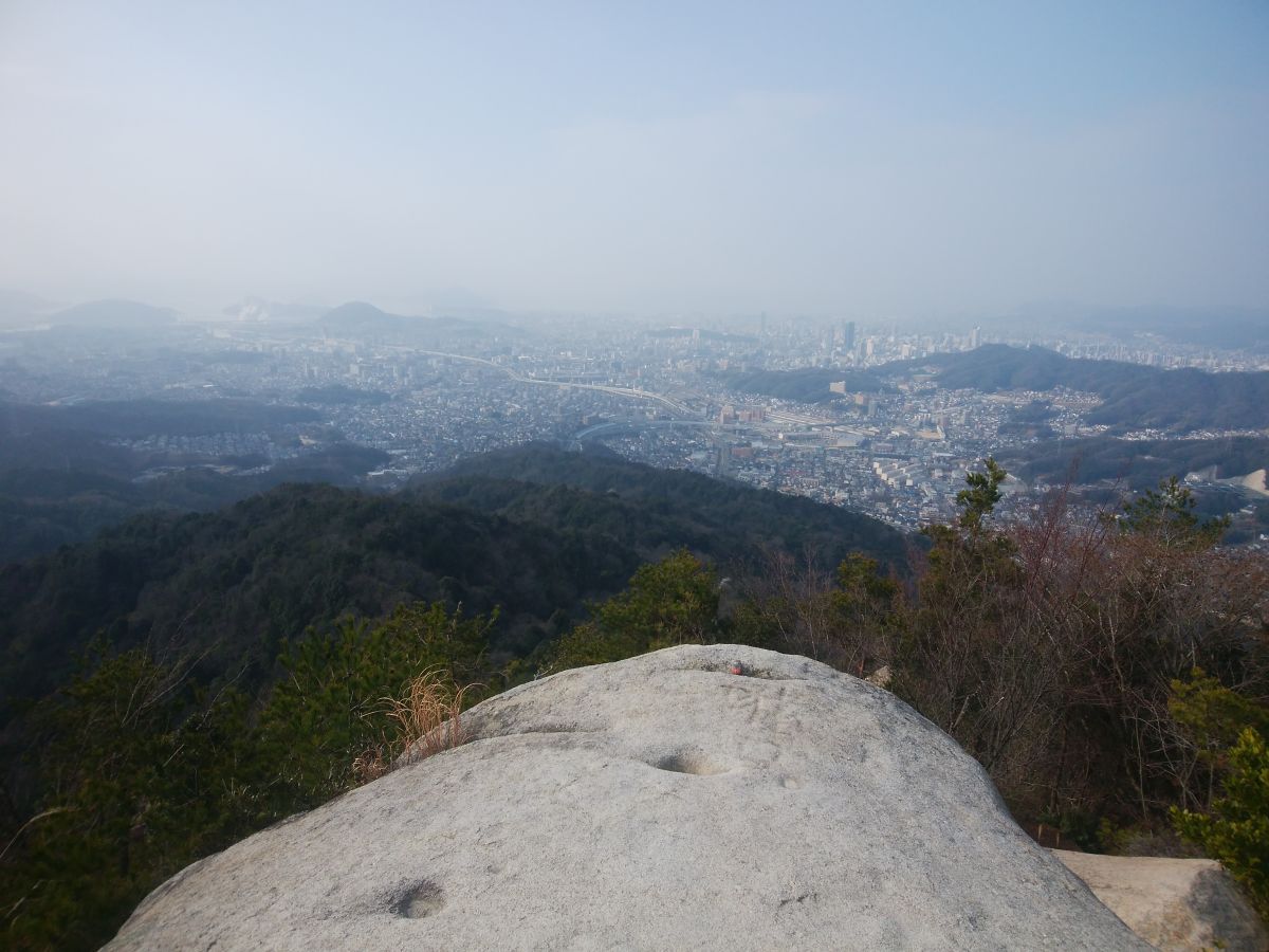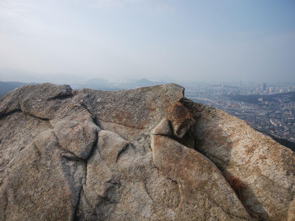 以前の広島遠征でナイトハイキングした岩谷観音ですが、昼間にも登っておきたいと思い今回は朝から登りました。展望地はやはり岩谷観音跡の手前にある岩上が一番視界が広くよく見えます。岩谷観音跡からは岩登りの連続になりますが、距離的には0.4kmほどなのでそこまで時間はかかりませんでした。高尾山山頂のピークハントしましたが、とても山頂といえるような場所ではなく登山道の途中といった感じでした。まあ、ピークハントはただの達成感でしかないですね。昨日と違って、気温があがってかなり霞んでしまっていたのが残念でしたが、夕方からまたナイトハイキングを予定していたので朝からいい運動になりました。ここは山頂が高尾山になっていますが、岩谷観音跡がメインのようで観光系のホームページなども岩谷観音を紹介しているようです。下山後は牡蠣のお好み焼きを食べに行って原爆ドームや広島平和記念資料館を見に行きました。