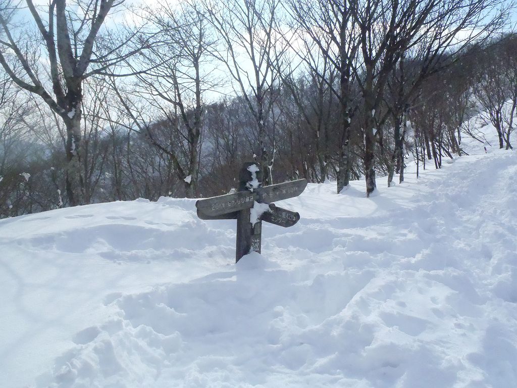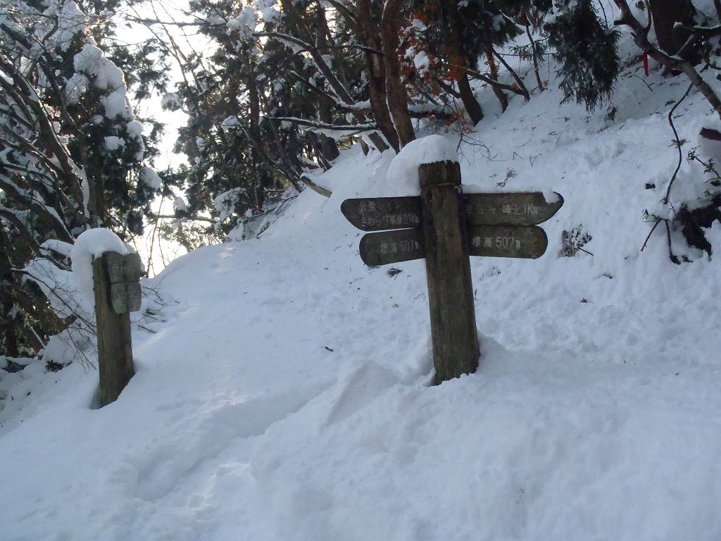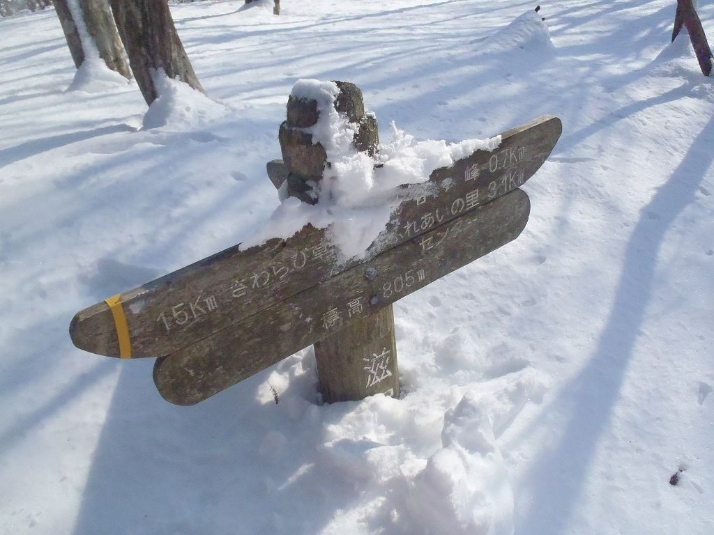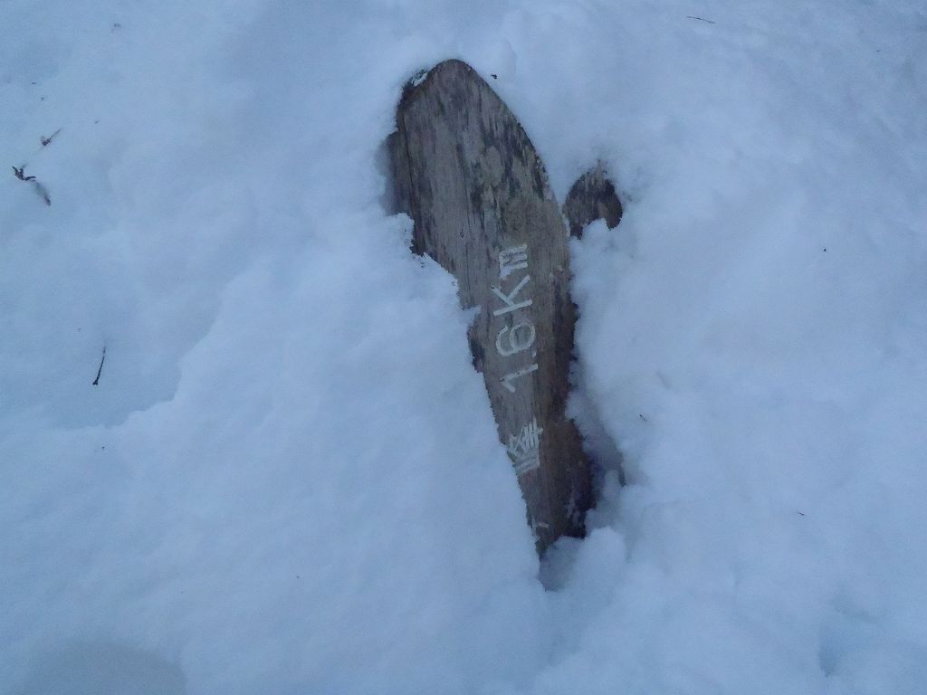 雪に埋まってる変な向きの道標。