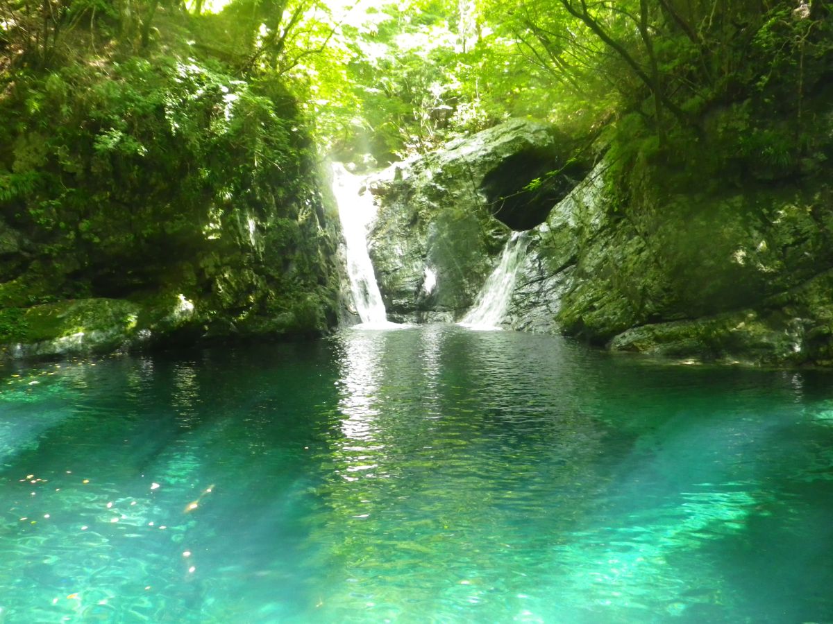 釜滝に到着。本日も日が差して滝壺はエメラルドグリーンになっていて流れる二つの滝が美しい