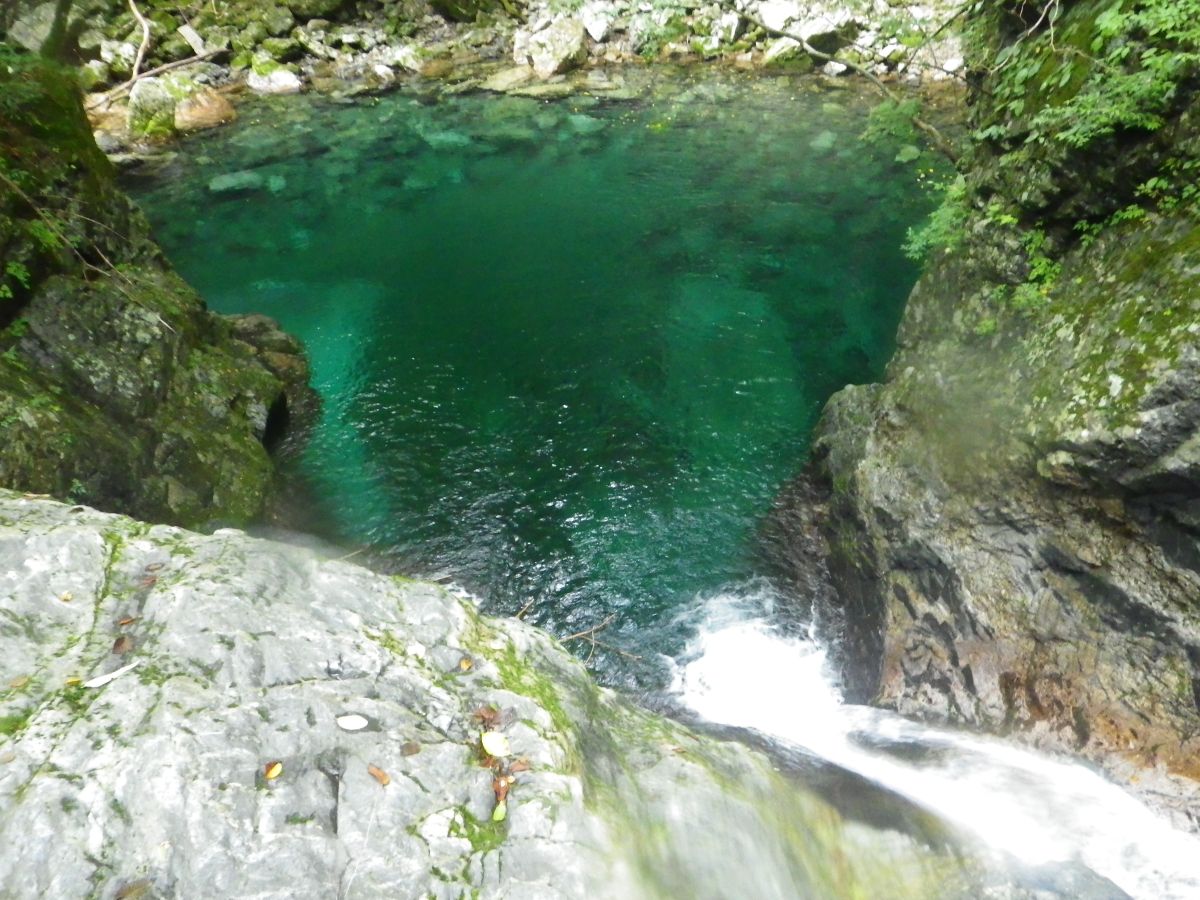 上から見た釜滝。右側の滝をスライダーするわけではないので注意。あくまで左側からスライダーをする