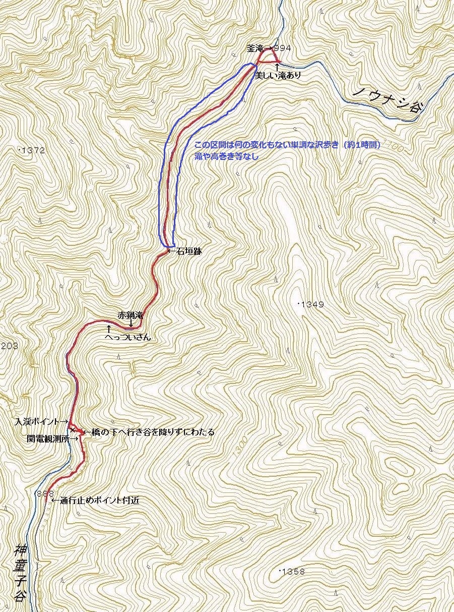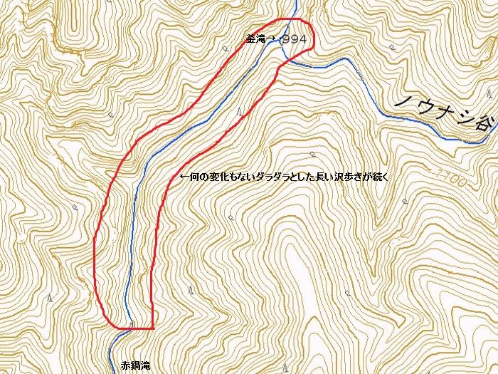 GPSで見ると赤枠で囲っている部分をこれから遡行しなければならない。距離が約1kmほど。実際に歩いてみると高巻きも変化もない、ただの単調な長い沢歩きになりました。時間にして約1時間ちょいでした。