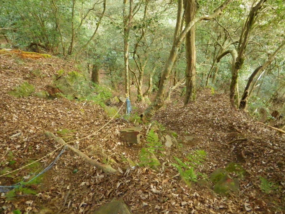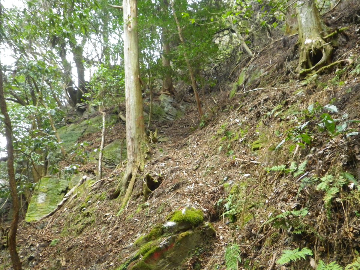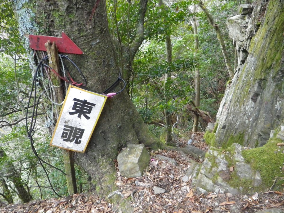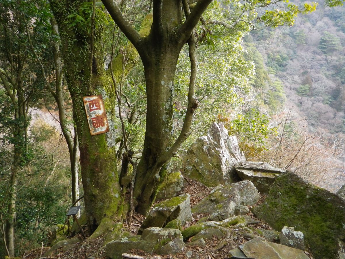 西覗という古い看板があった。とにかくものすごい急斜面の下りなんだけど、問題は落ち葉でかなり滑りやすい
