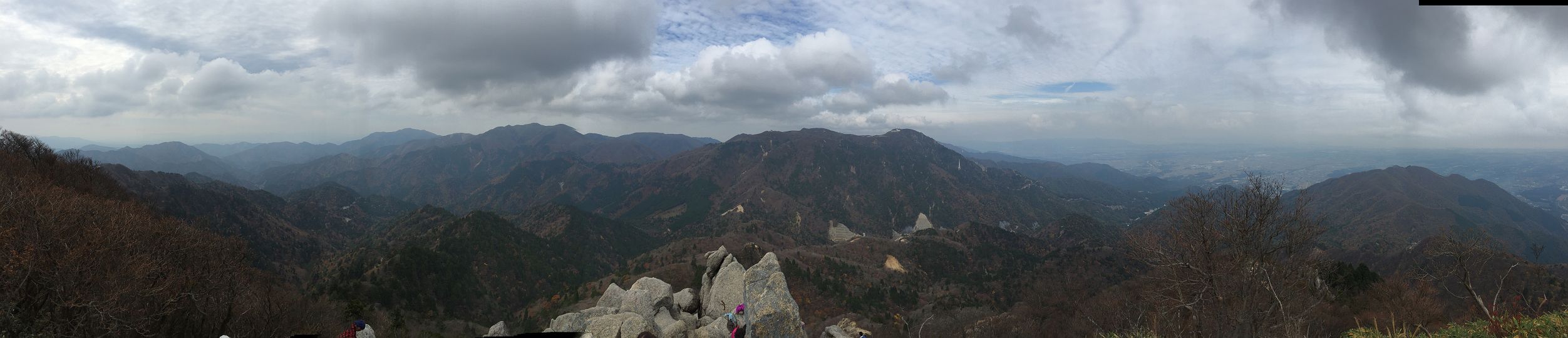 鎌ヶ岳からの展望はパノラマでどうぞ。真ん中は御在所岳、向こう左側に二つ割れた山は先日いった雨乞岳