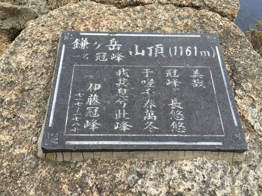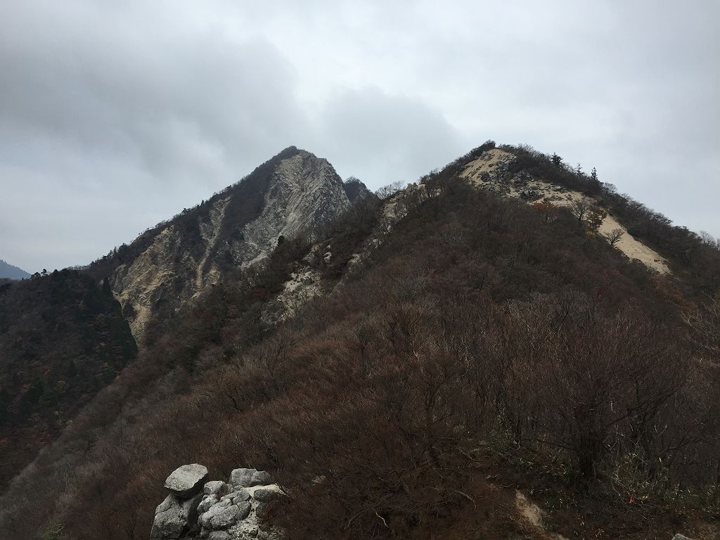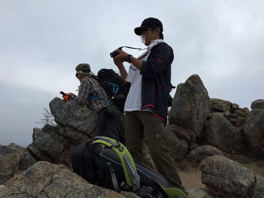 通ってきた岩場のピークを振り返る。向こうに鎌ヶ岳のピーク