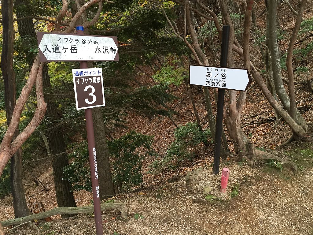 宮妻峡の登山口。入道ヶ岳へは左。鎌ヶ岳はここをまっすぐ林道を歩く