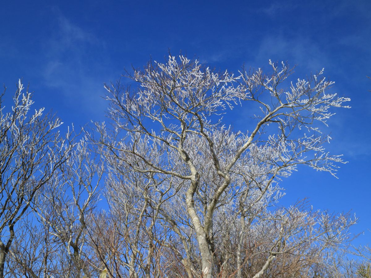 見上げると樹氷が見えた。霧氷ではなかったけど青空で樹氷を見れたのはよかった