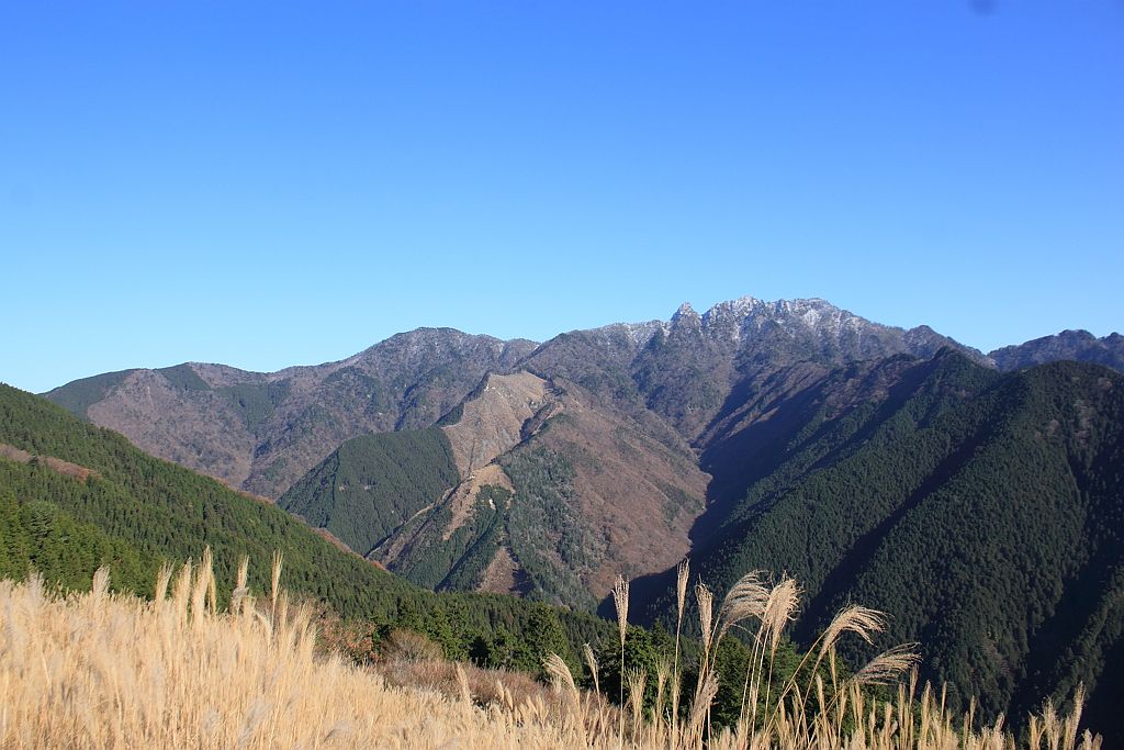 雪がかぶった山上ヶ岳、大日山、稲村ヶ岳
