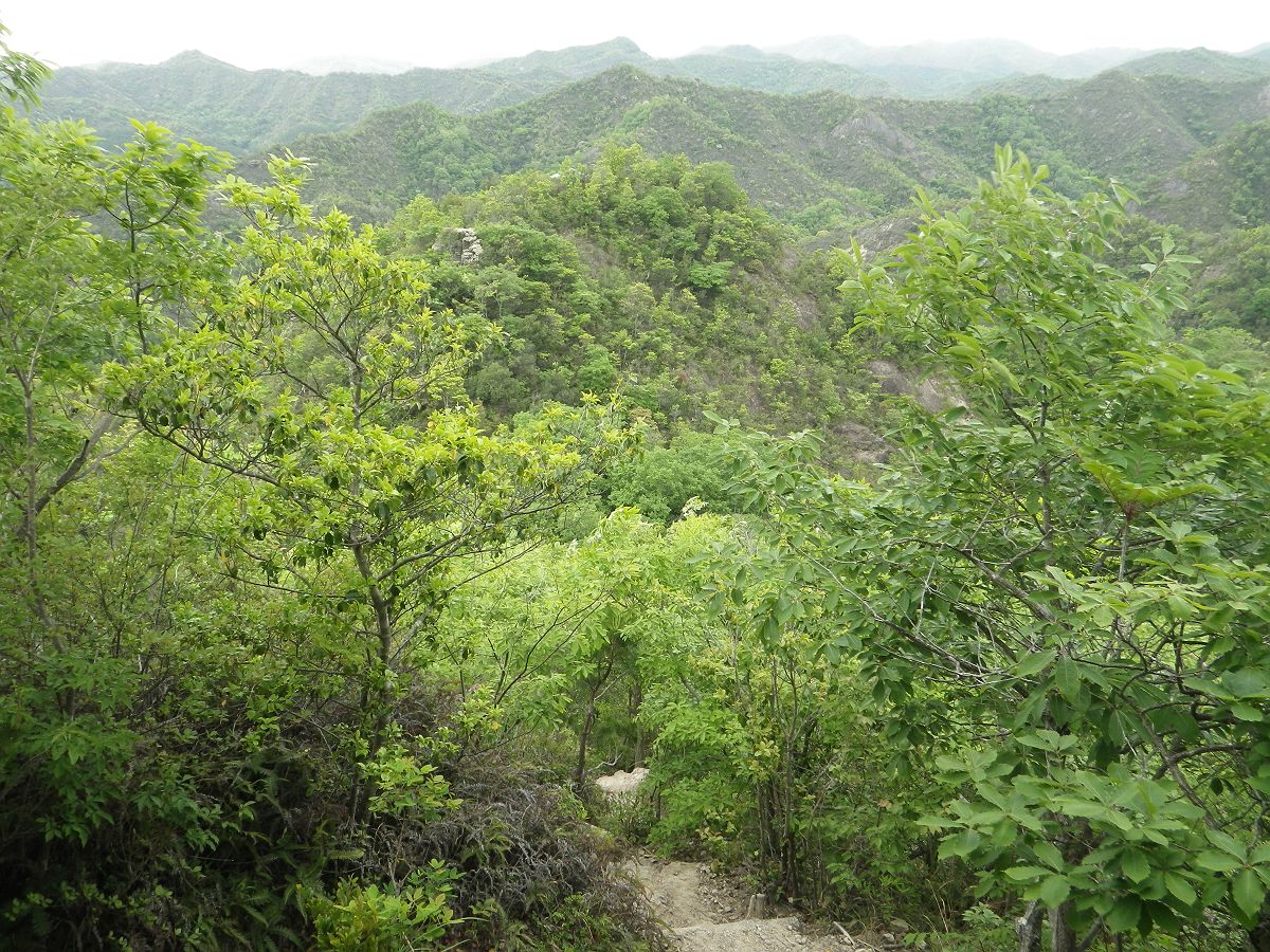 下りはもちろん急斜面になっていて写真では見にくいけど、途中のピークに東屋が見えた。あそこへ登り返すのかと思うと少しテンションが下がってきた