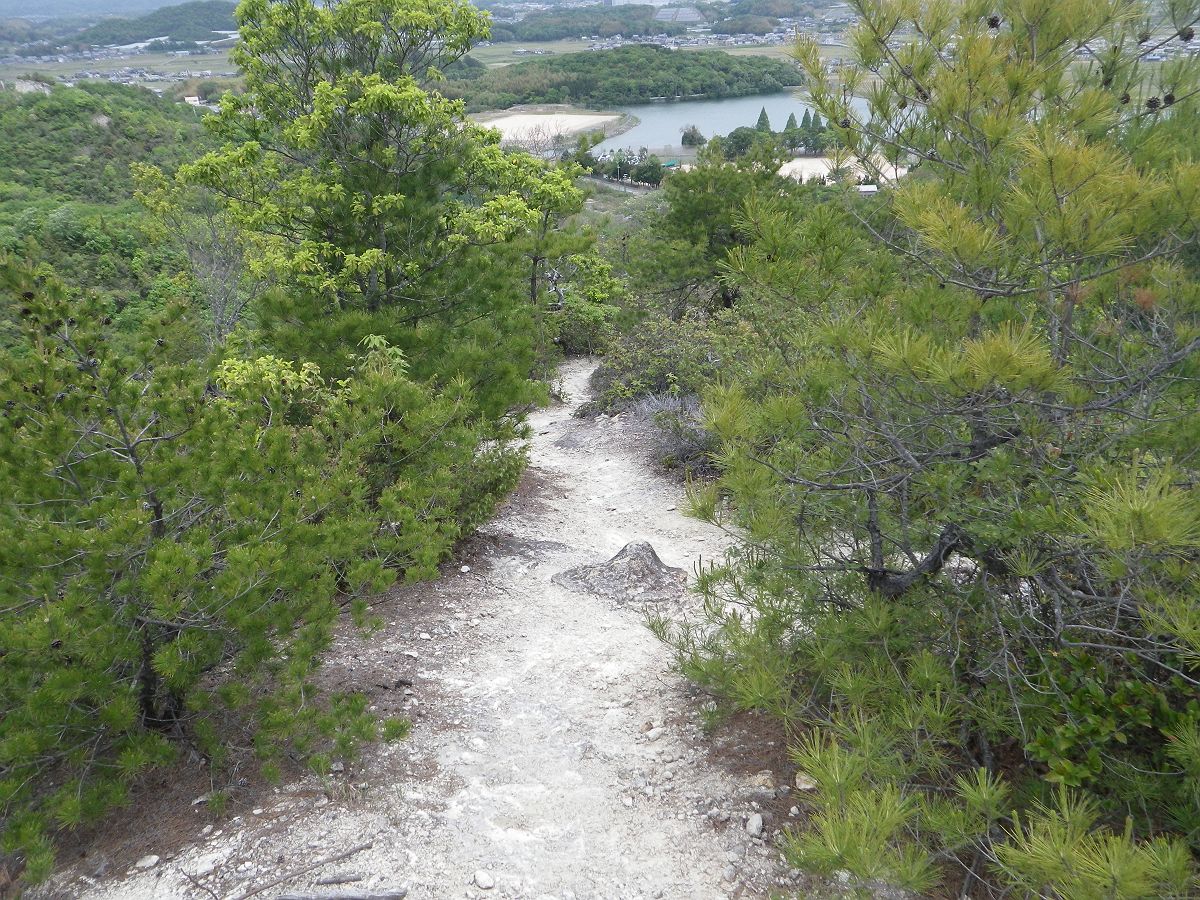 一気に標高100mほど下っていくことになる。下りもザレ場になっていて滑りやすかった。この先は階段になるけど、段差がすごかった