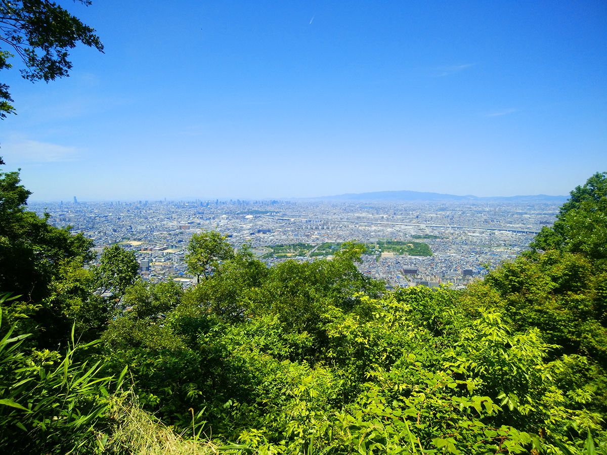 休憩所からの展望。もっと視界が広かったんだけど、もはや樹林が生えて視界が狭くなっている。梅田のビル群やあべのハルカスも見える