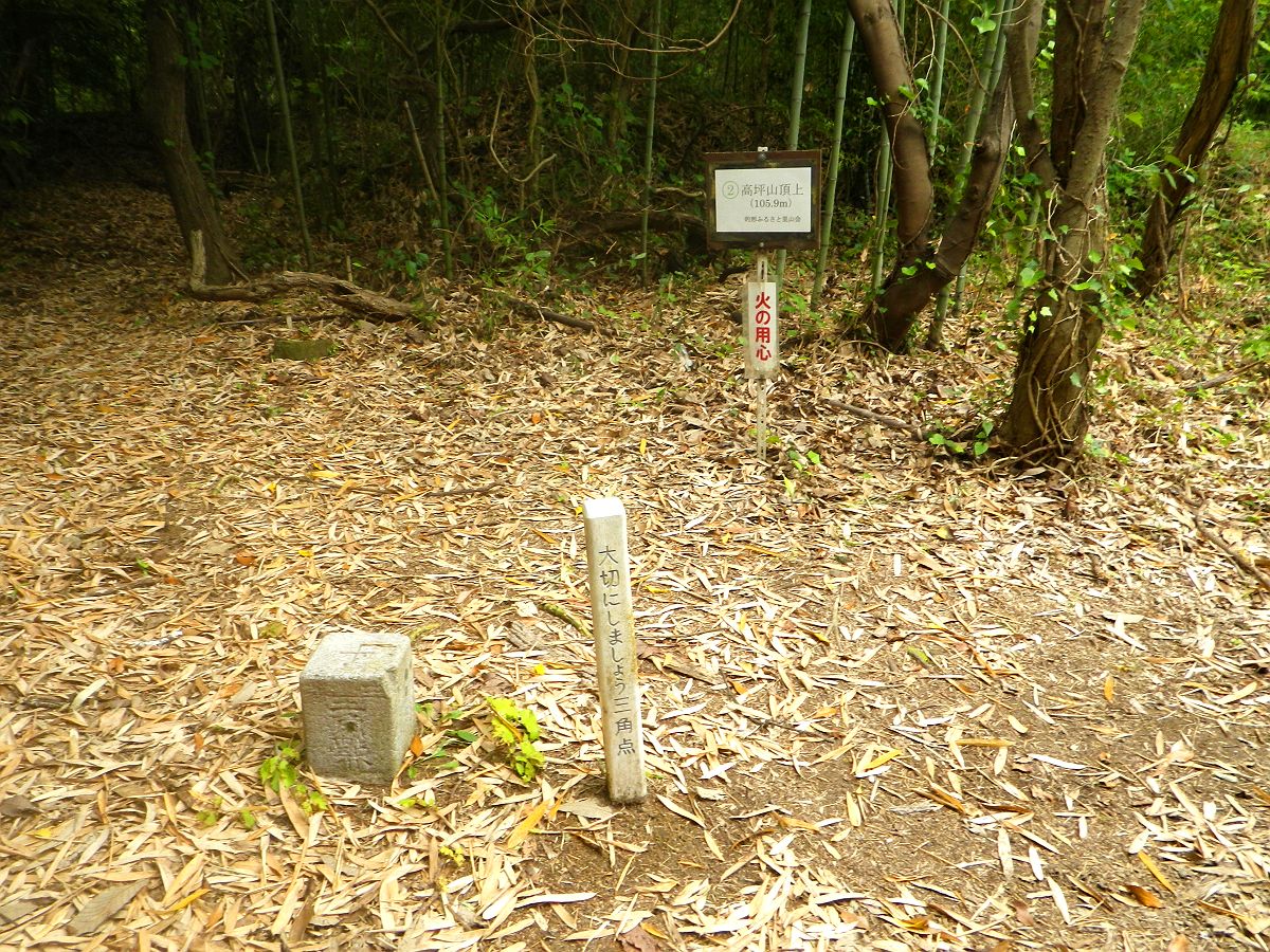 高坪山(105.9m)の山頂看板と三角点があったので撮影しておいた