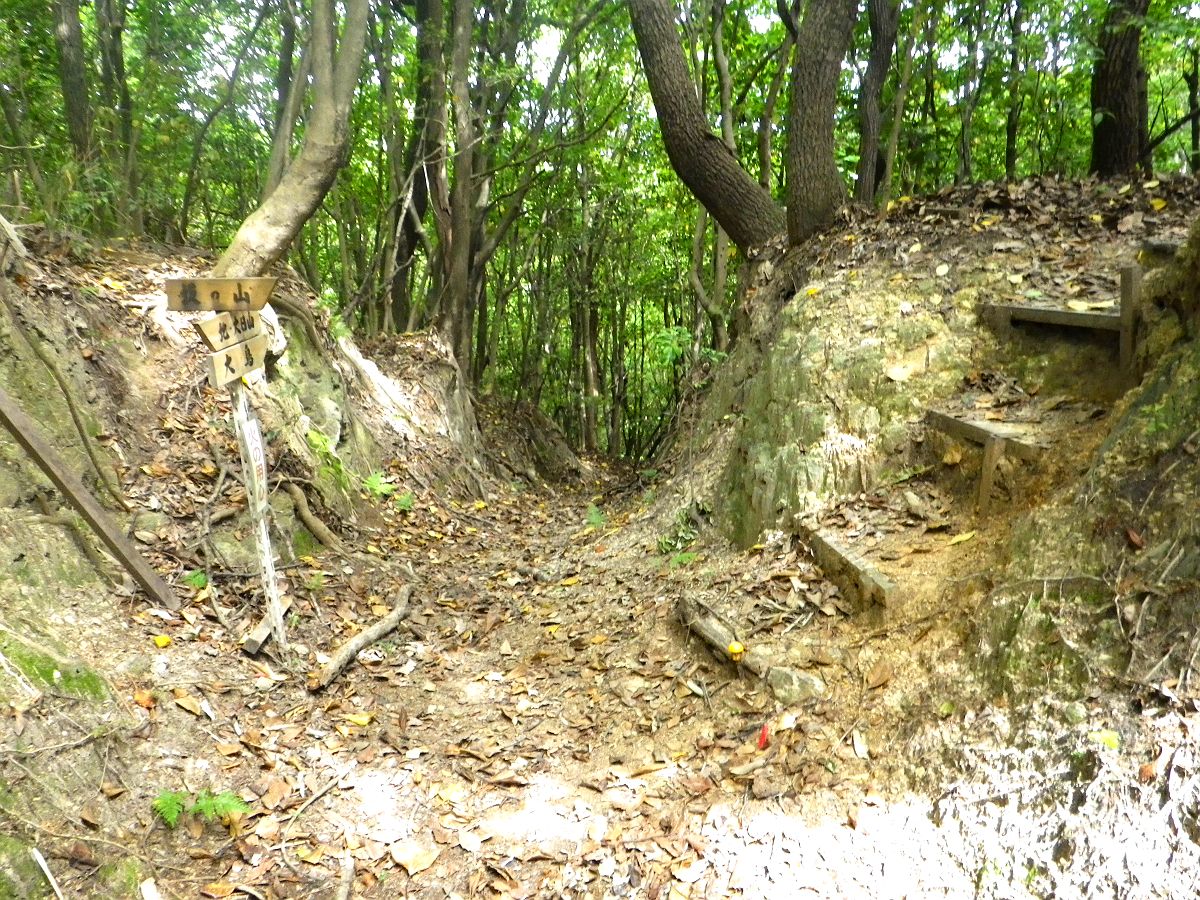 さっきの階段を登りきるとコースアウトで左側から登るのが正解だった。ここで向山~磯山への道標がでてきたので従って登っていく