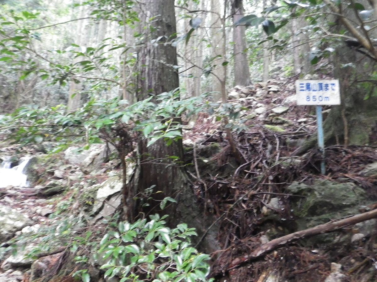 三尾山頂まで850m地点。この付近から沢の水量が多くて滑りやすかった