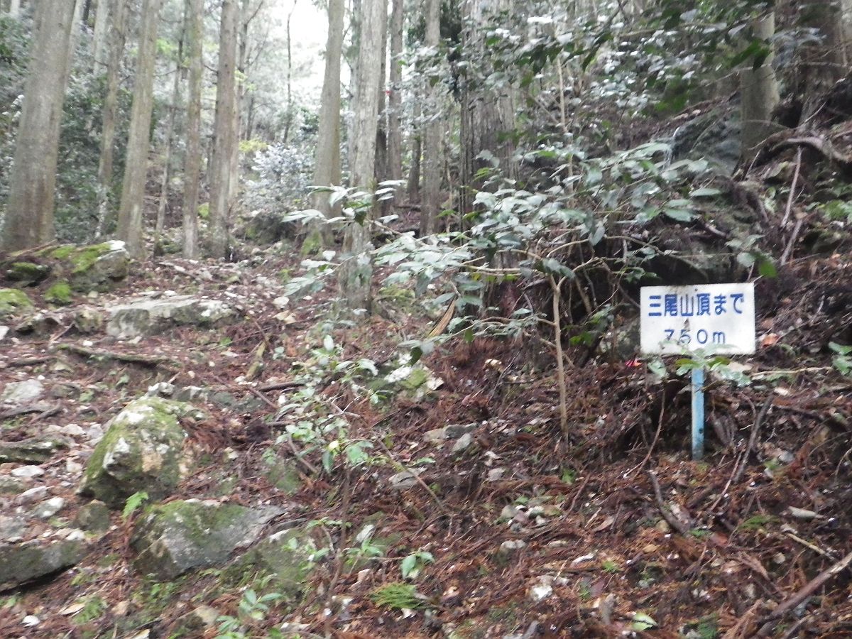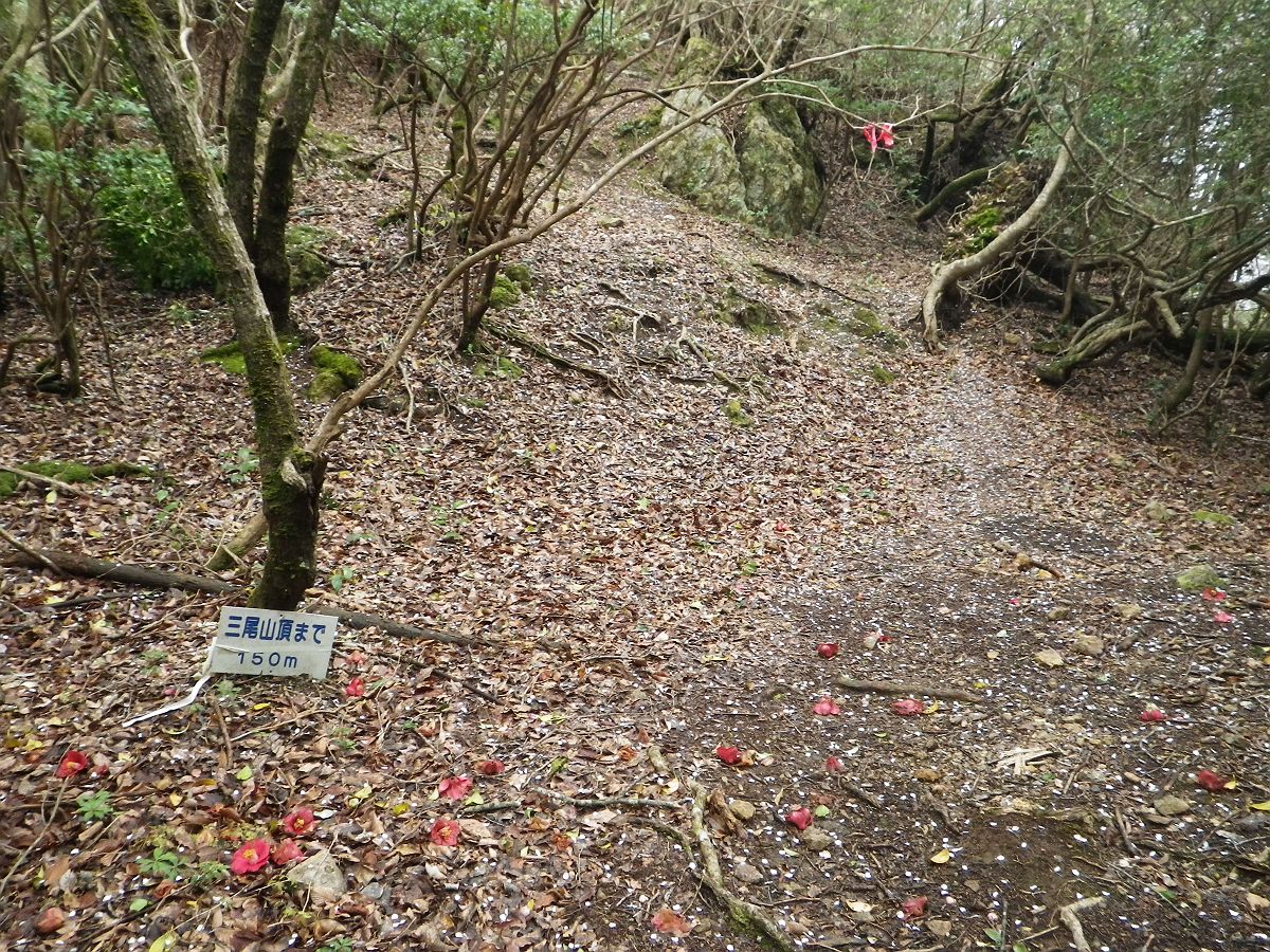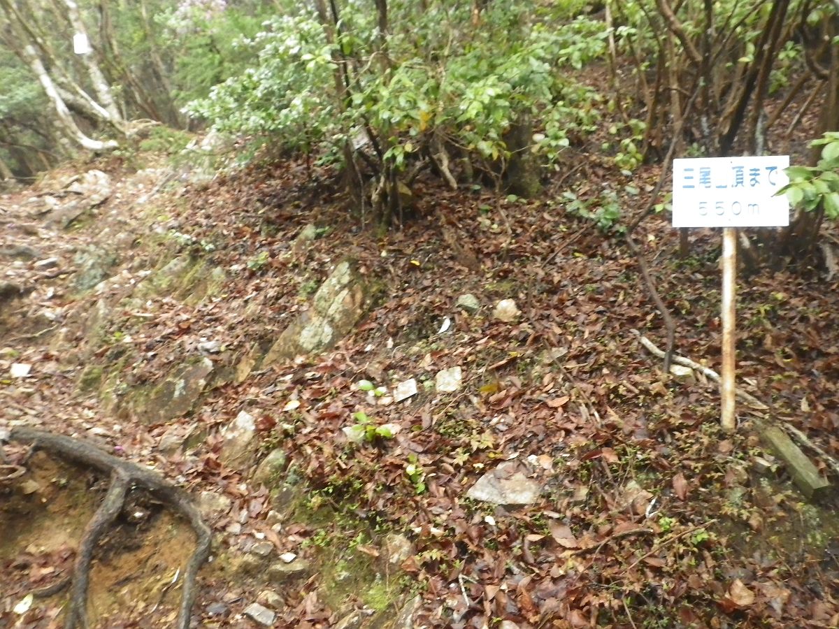 西峰を本峰のほうに下っていくと、ちょうど三尾山頂まで150m地点だった。いよいよ最後の登りとなる