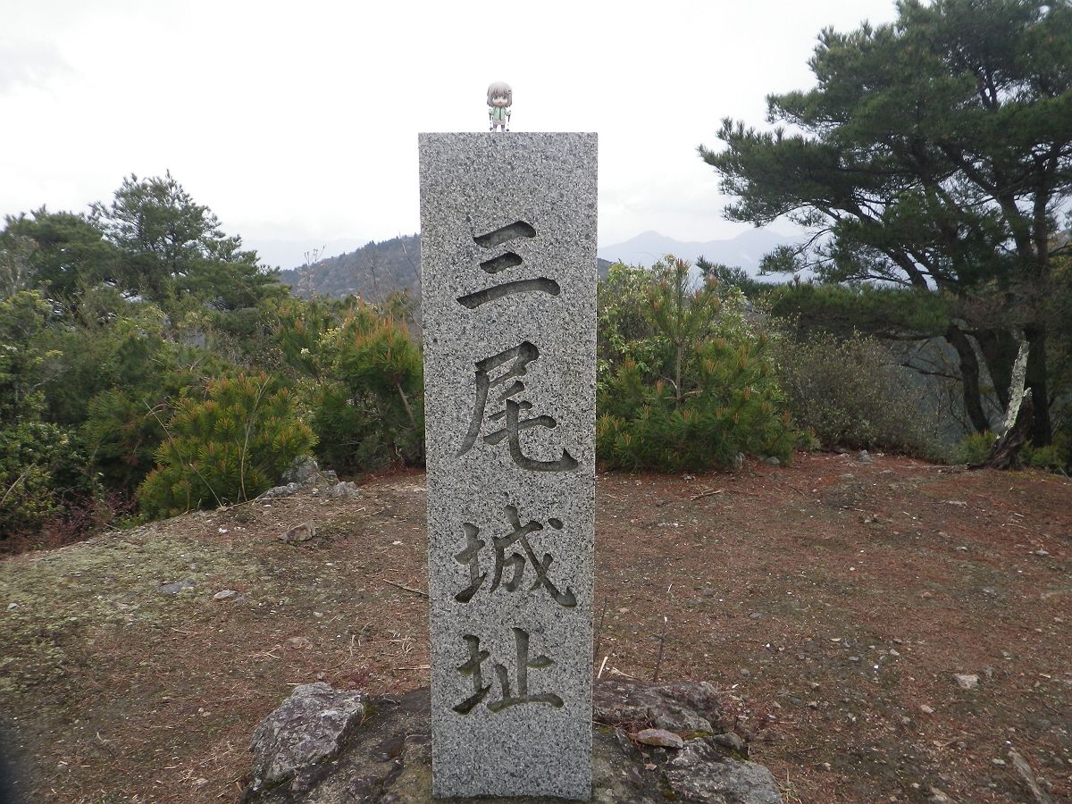 三尾山本峰(586m)に到着。山頂は広く、真ん中に三尾城址という石碑が立っている。やっとベンチに座って大休憩できそう