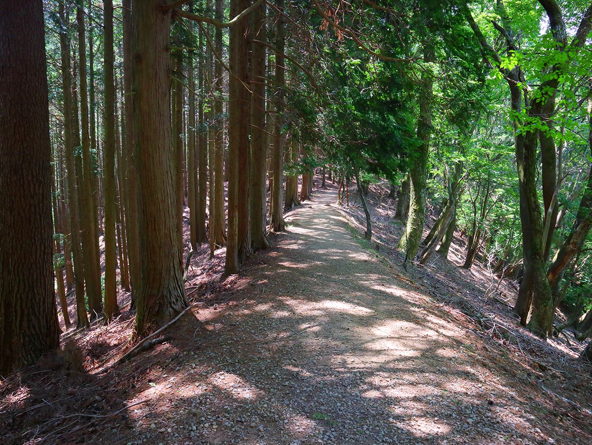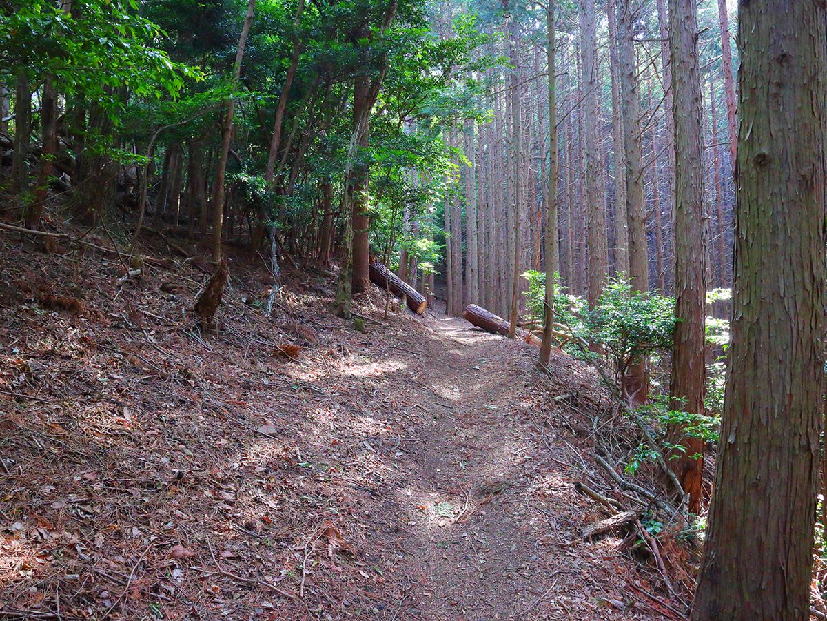 植林地帯だけどなだらかな登山道が続く。ちょっとしたアップダウンはあるけど大したことはない