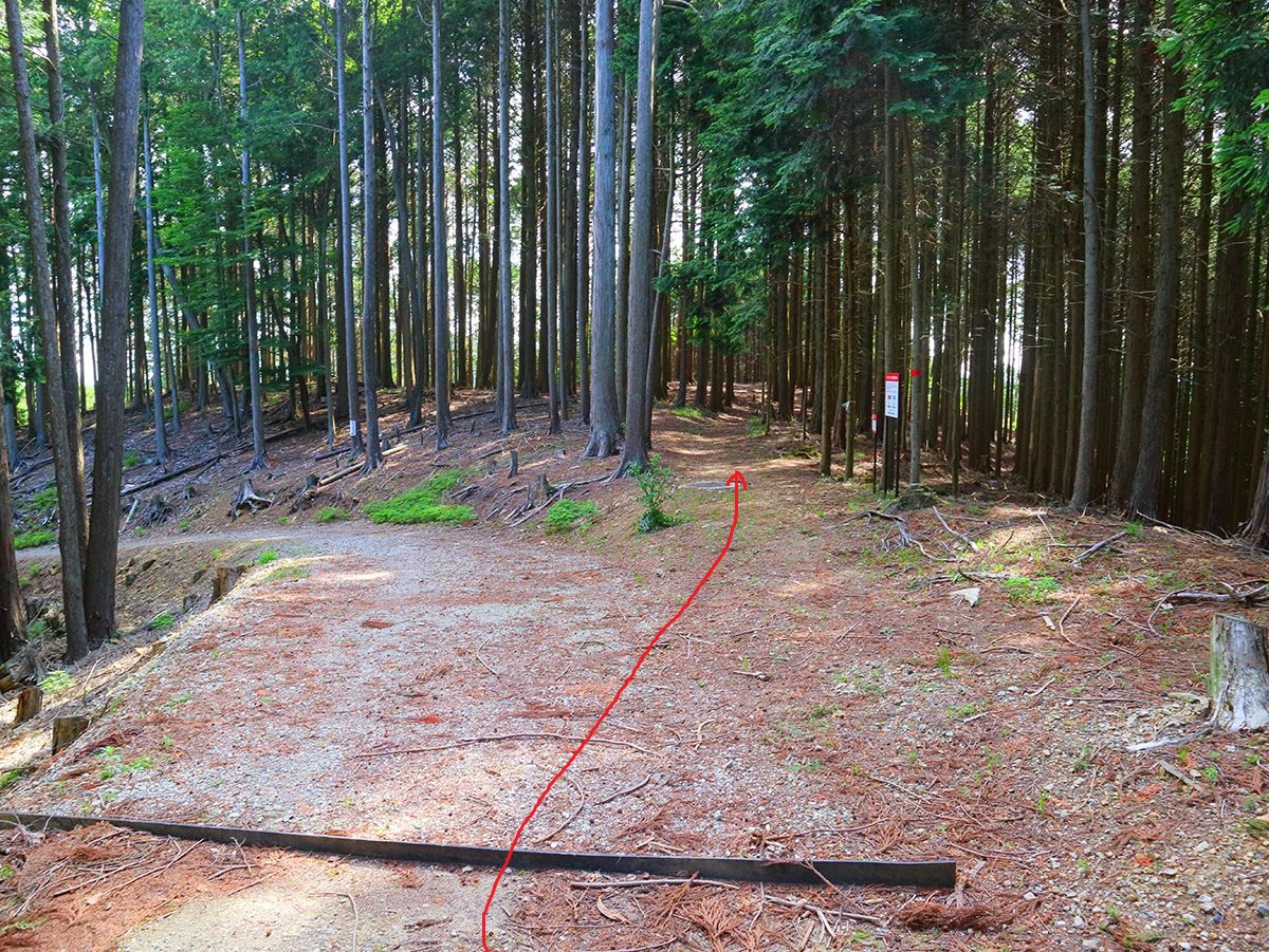 ここで広い道の分岐にでる。とりあえずルートは左だけど、天台山へピークハントしたいので直進してピークへ登る