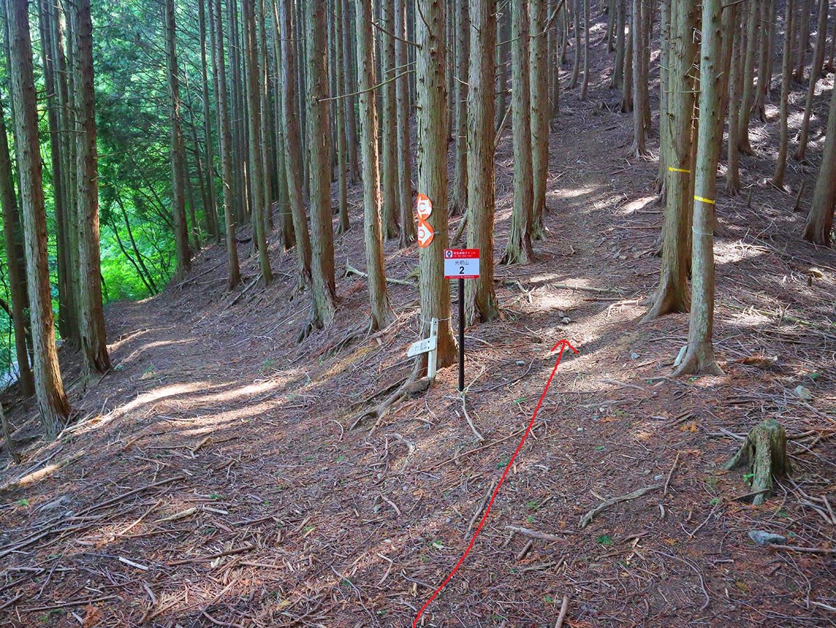 さっきの広い道の分岐に出て左へ下っていくと右手に登山道がある。左を下ってもいけるけど地図に従って直進する