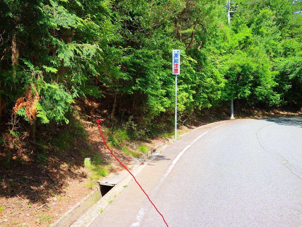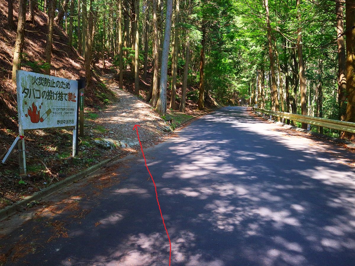 ここで道路から左側の登山道に入る。道路のヘアピンカーブをショートカットできる感じ