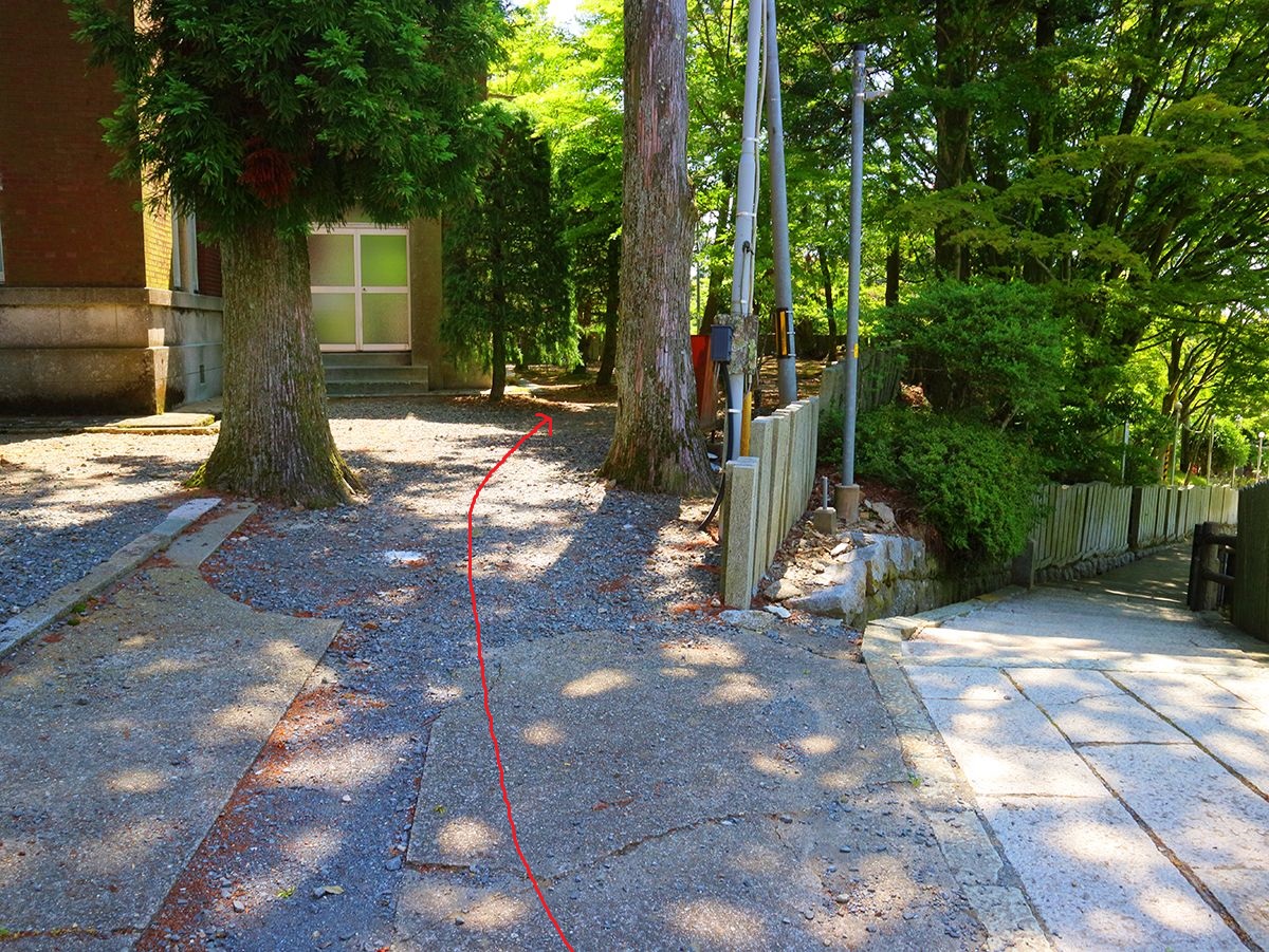 三角点に行くために参道からここを左へ入って奥の道を左のピークへ登る