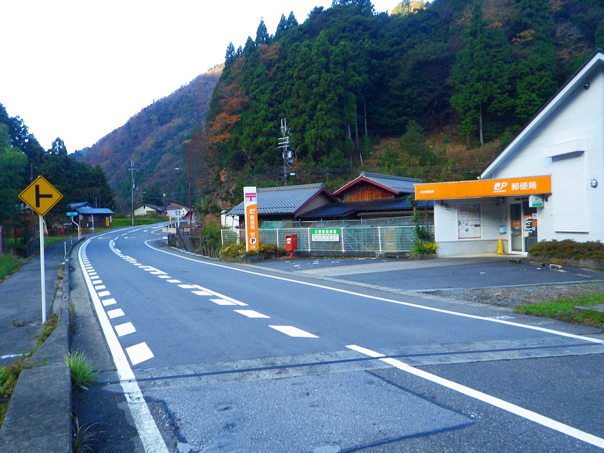 この郵便局の向こう側を右に曲がって県道34号線に入る
