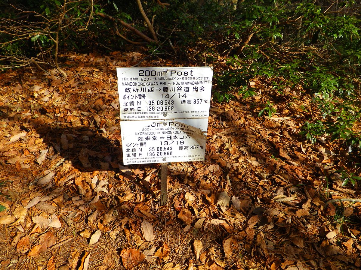 藤川谷道出会の分岐。下山は政所へ向かうのでこのまま道標に従って政所方面へ進む