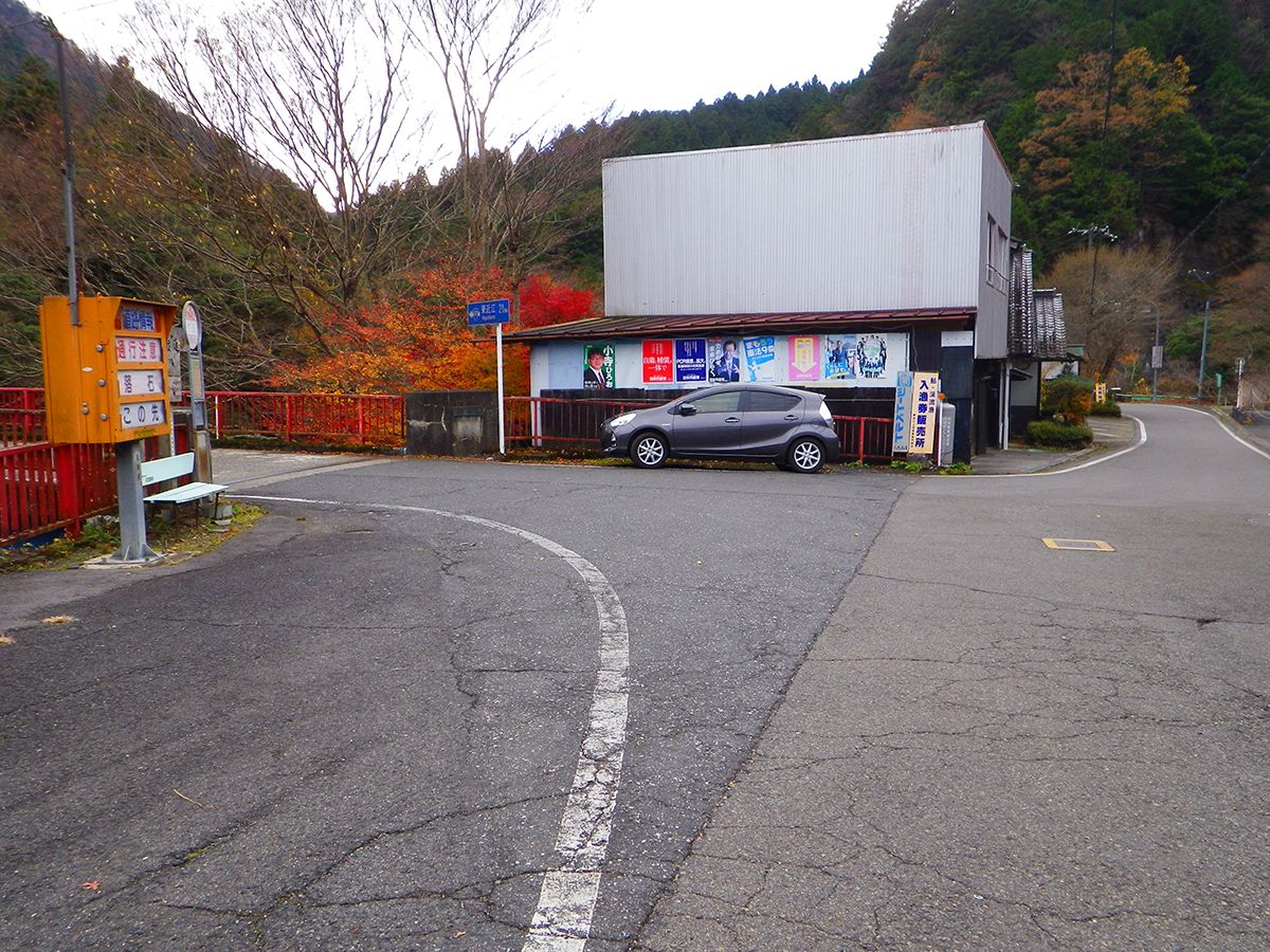 県道34号線を歩いていくと左側に赤い橋があるのでこの橋を渡って国道421号線に出て左へ