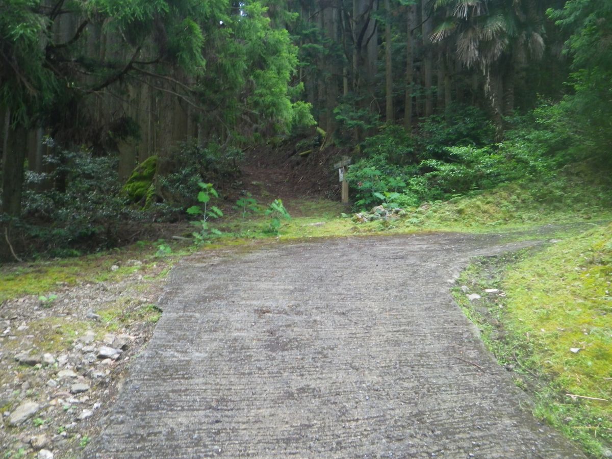 ここで林道が終わって登山道に入る。林道はこの先、右側に続くけど使われてるかわからない建物のところで終わっているようだ