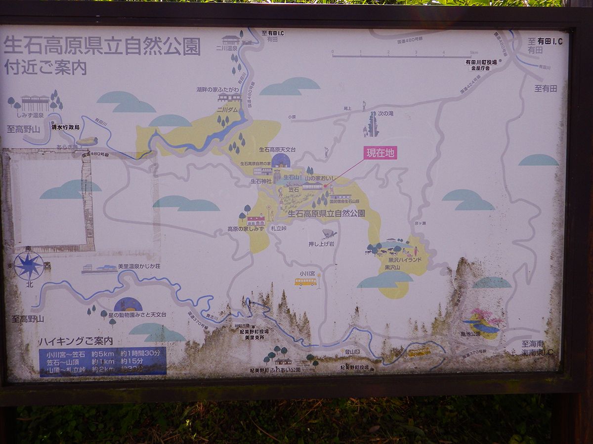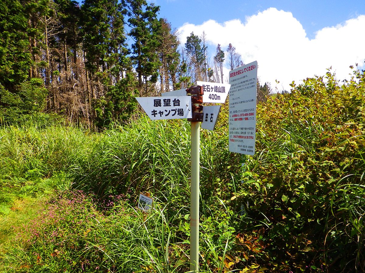 生石高原の案内板があったので見ておいたけど笠石~山頂まで1kmで15分くらいなのか